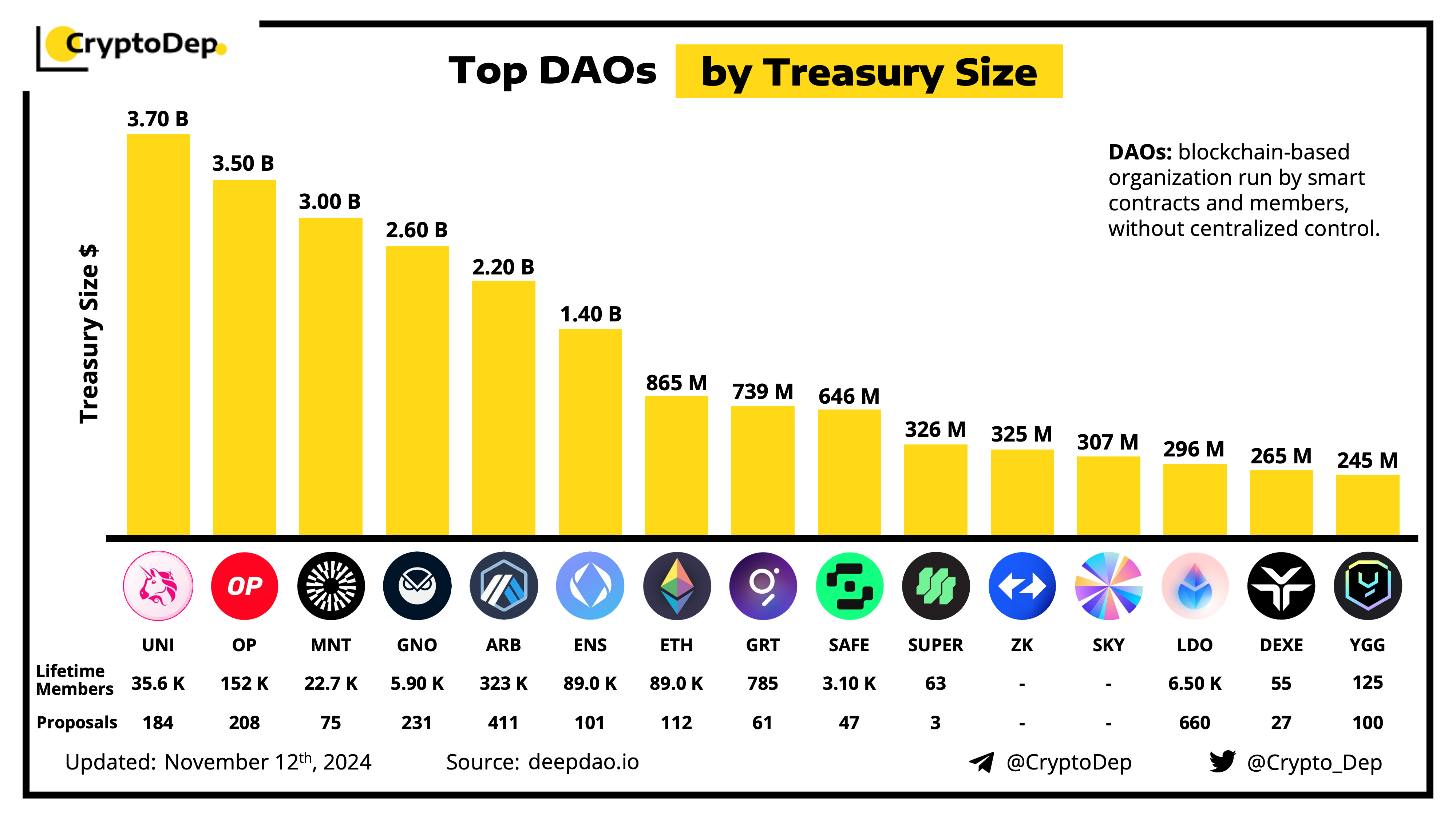 According to the data from DeepDao, approximately 50,873 DAOs have $27B owned assets. We have composed the list of top DAOs, ranked by the total assets that the DAO may use at its discretion.