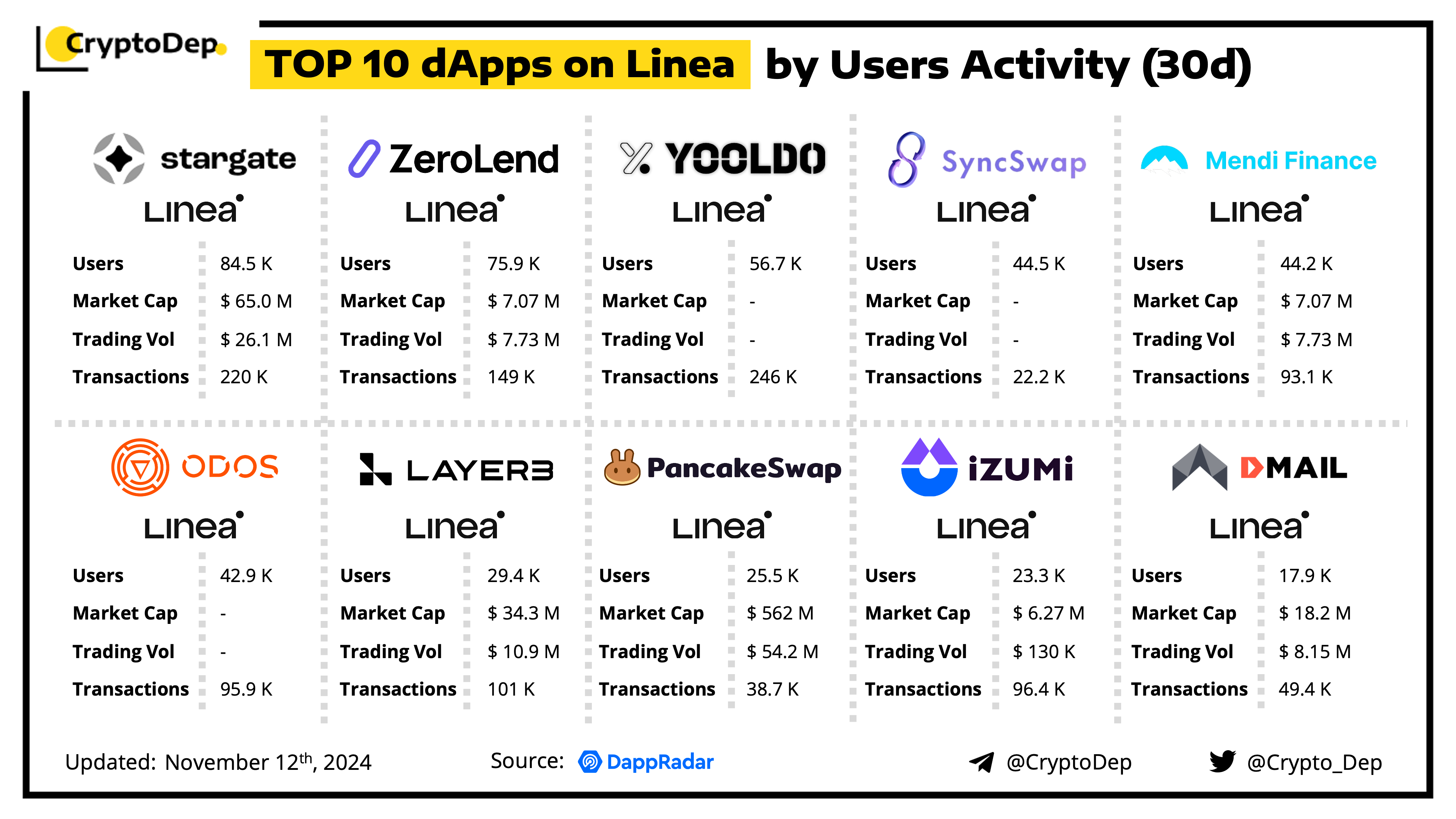 A decentralized application (dApp) is a program built on blockchain that combines a smart contract and a front-end user interface. We present the top dApps on #Linea by users activity in the last 30 days, according to the data from DappRadar.