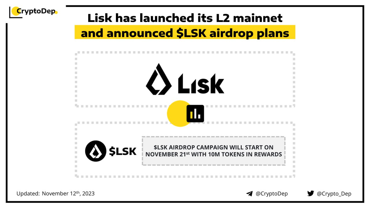 The Ethereum Layer 2 network Lisk has launched on mainnet and announced an upcoming $LSK airdrop. Lisk's airdrop campaign will begin on November 21st with 10M $LSK tokens ($9.39M) in rewards. Users can claim points by completing tasks on the Lisk platform. Lisk is an Ethereum L2 that works on OP Stack and Gelato rollup-as-a-service platform.
