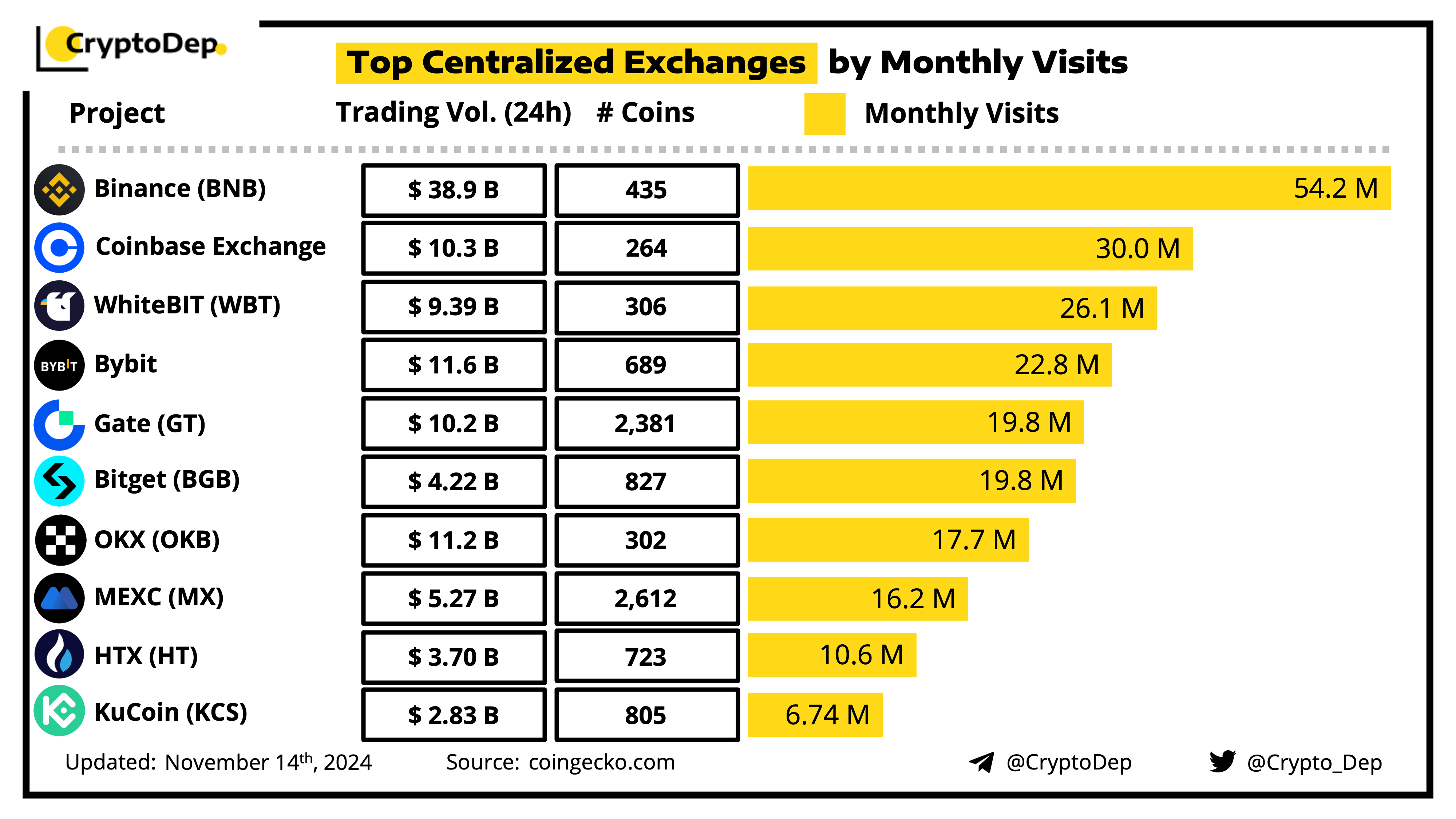 Let's take a look at the ranking of top centralized exchanges by monthly visits. Monthly visits to the website (not including mobile app) based on data from SimilarWeb and CoinGecko.
