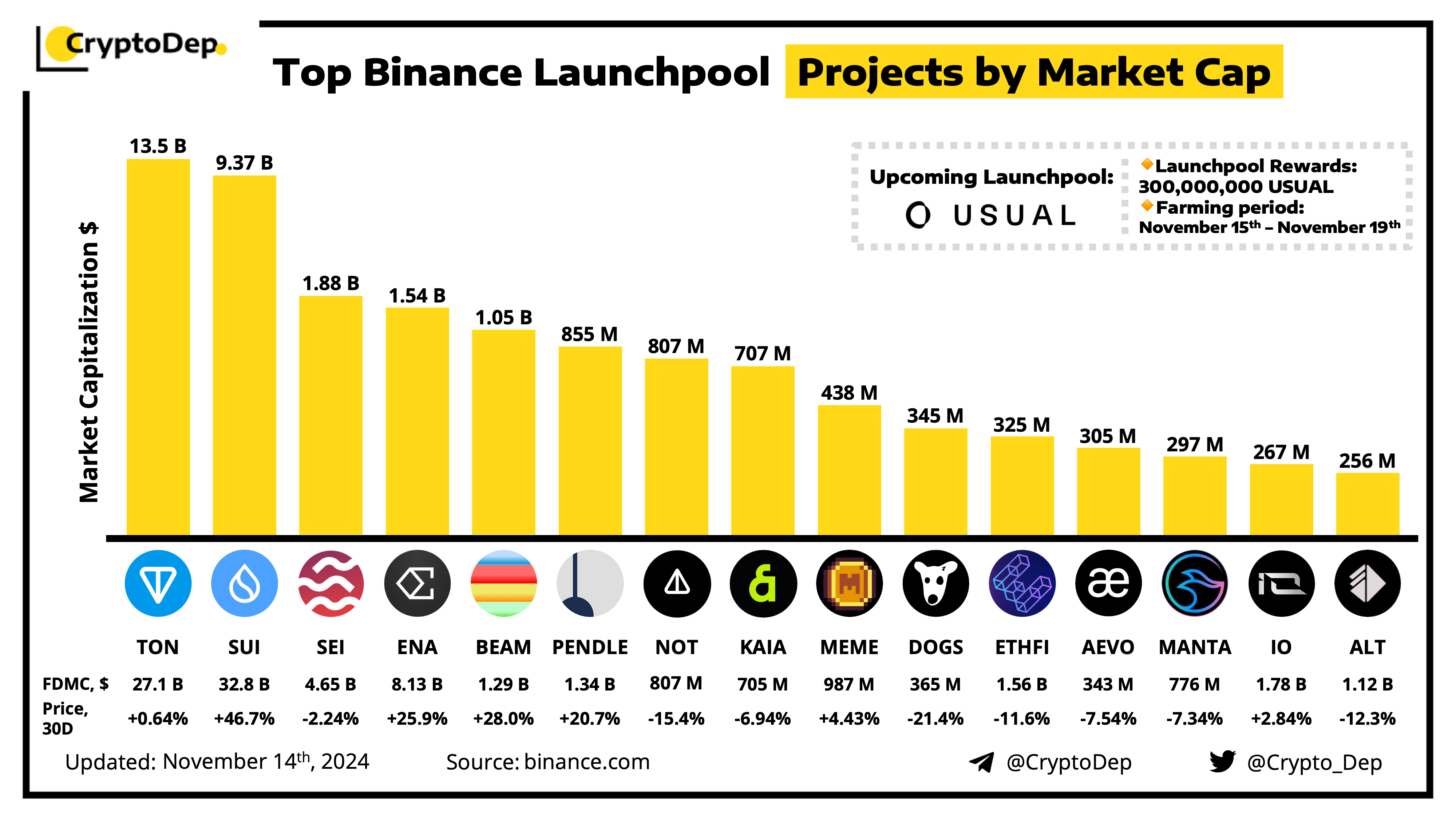 As announced today, Usual $USUAL became the 61st project on the Binance Launchpool. Let's analyze the current state of top projects that have been launched via the Binance Launchpool.