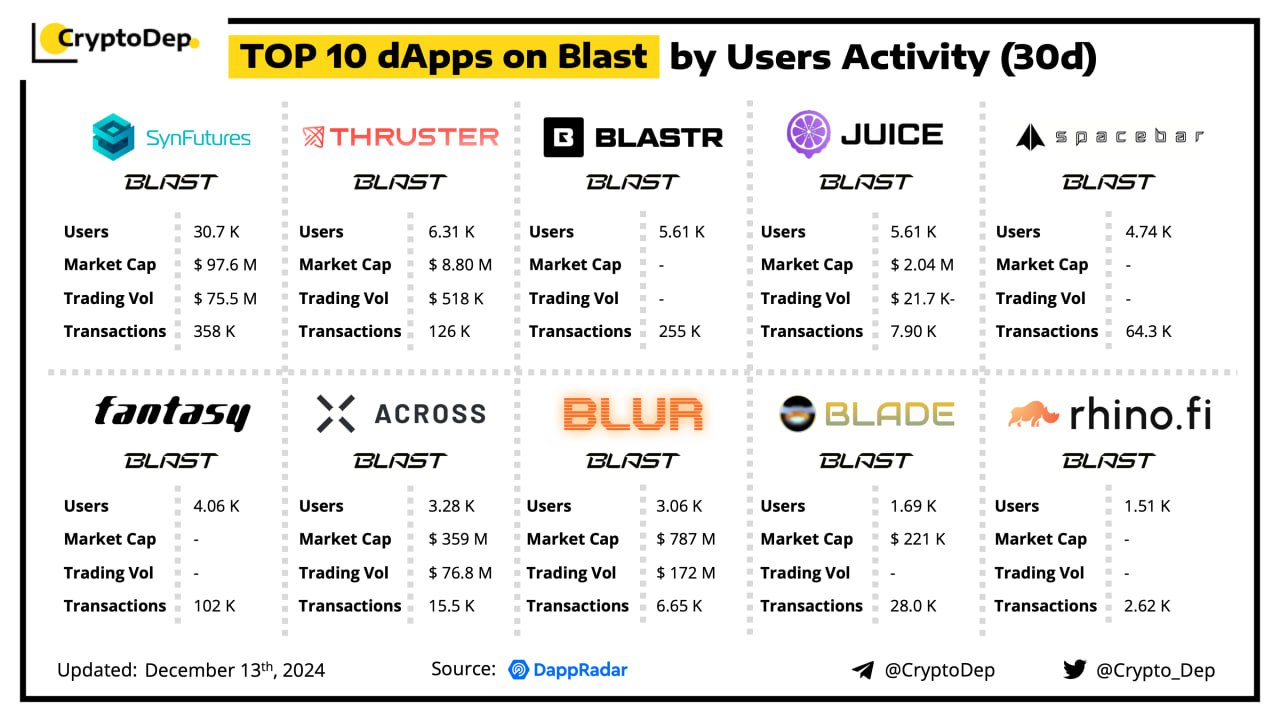 A decentralized application (dApp) is a program built on blockchain that combines a smart contract and a front-end user interface. We present the top dApps on #Blast by volume in the last 30 days, according to the data from DappRadar.