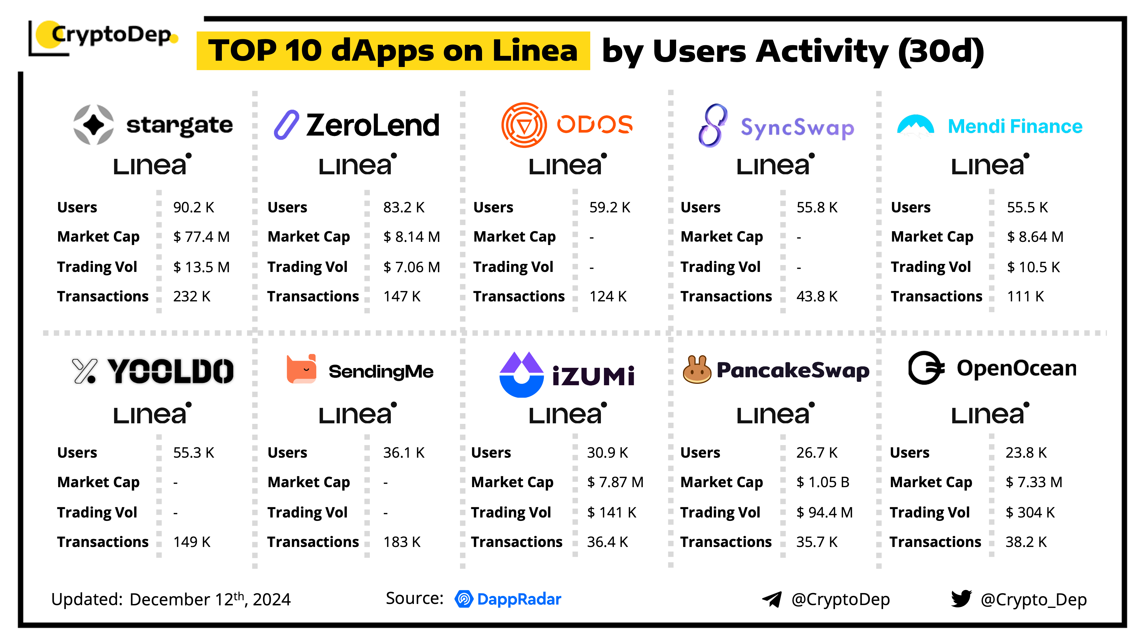 A decentralized application (dApp) is a program built on blockchain that combines a smart contract and a front-end user interface. We present the top dApps on #Linea by users activity in the last 30 days, according to the data from DappRadar.