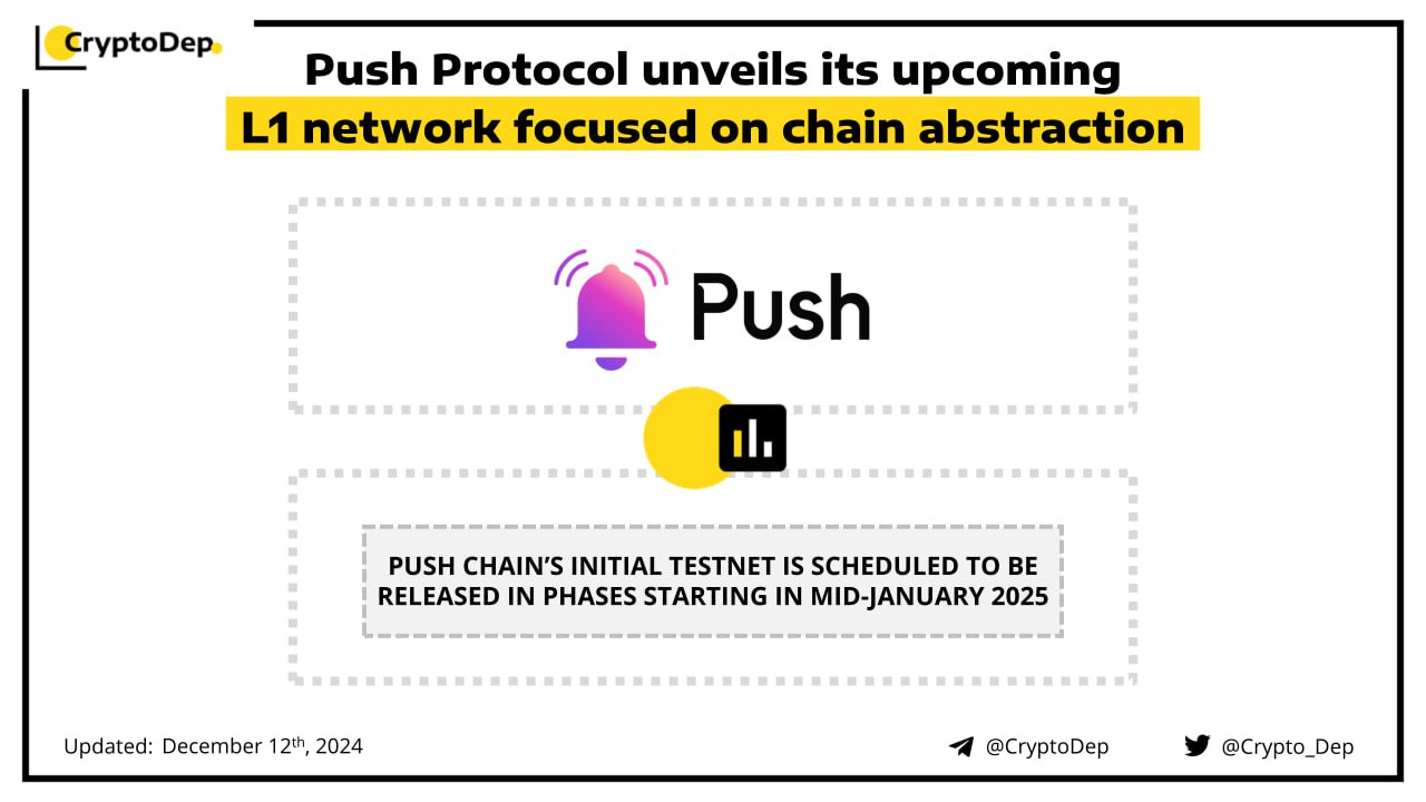 Push Protocol, a blockchain-based notifications project, is developing Push Chain, its Layer 1 blockchain. The network will be focused on chain abstraction and building web3 applications accessible across different networks. Push Protocol plans to launch the network's testnet in phases with the first phase scheduled for mid-January 2025. Push Protocol is backed by Binance Labs, Wintermute, Jump Crypto, and others.