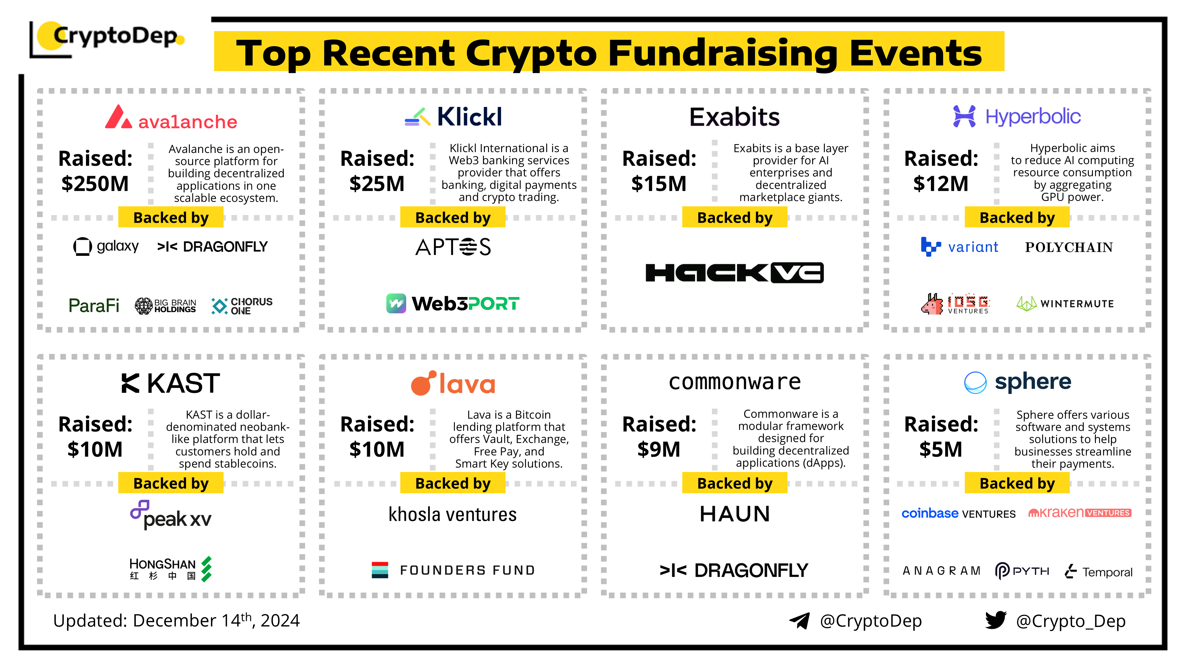 Presenting a list of some recent crypto fundraising events, backed by well-known investors such as Polychain, Dragonfly, Hack VC, Haun Ventures, Coinbase Ventures, Wintermute, IOSG Ventures, Variant Fund, Founders Fund, Big Brain Holdings, Kraken Ventures, Aptos, and others. Let's take a look!