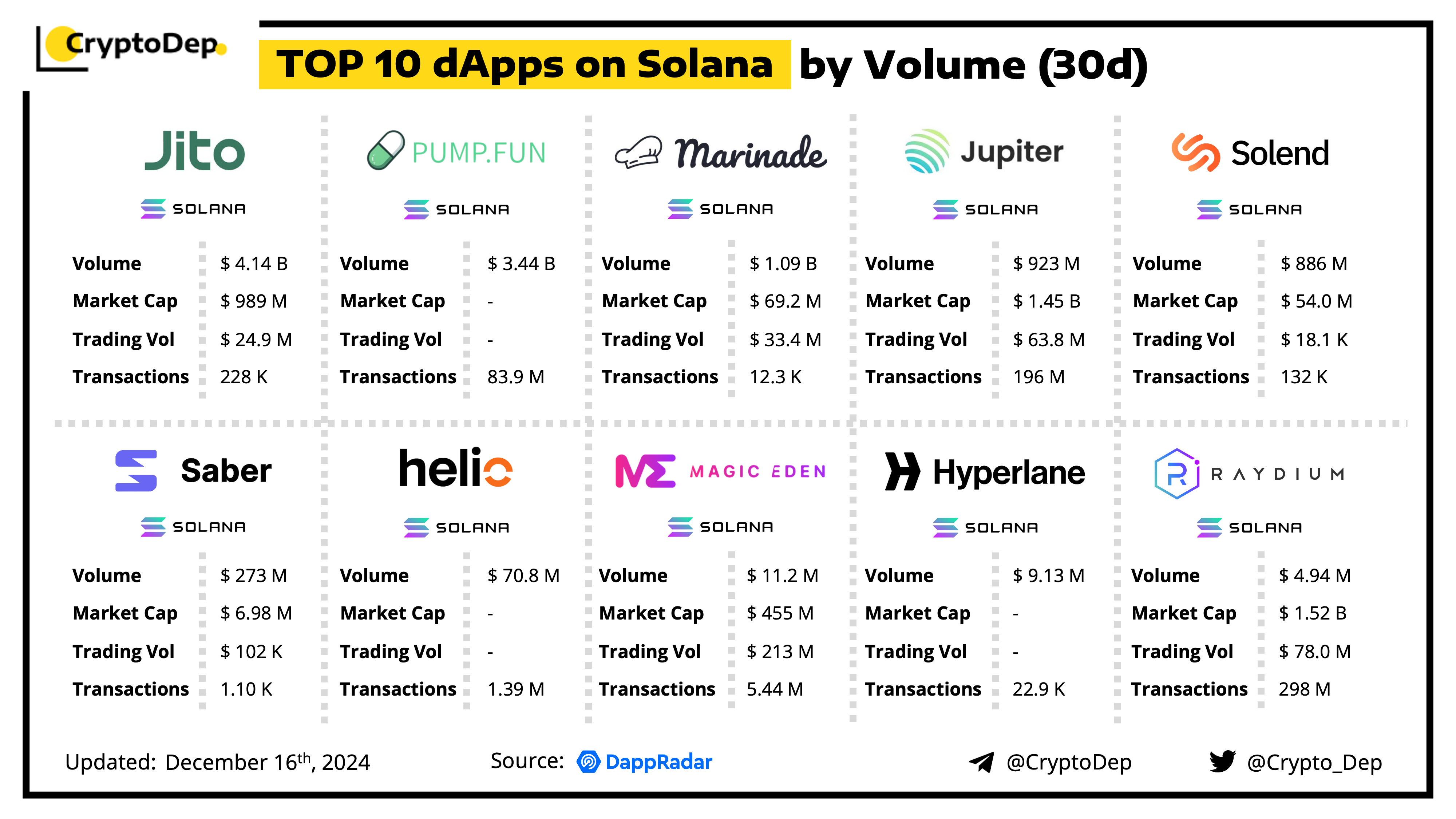 A decentralized application (dApp) is a program built on blockchain that combines a smart contract and a front-end user interface. We present the top dApps on #Solana by volume in the last 30 days, according to the data from DappRadar.