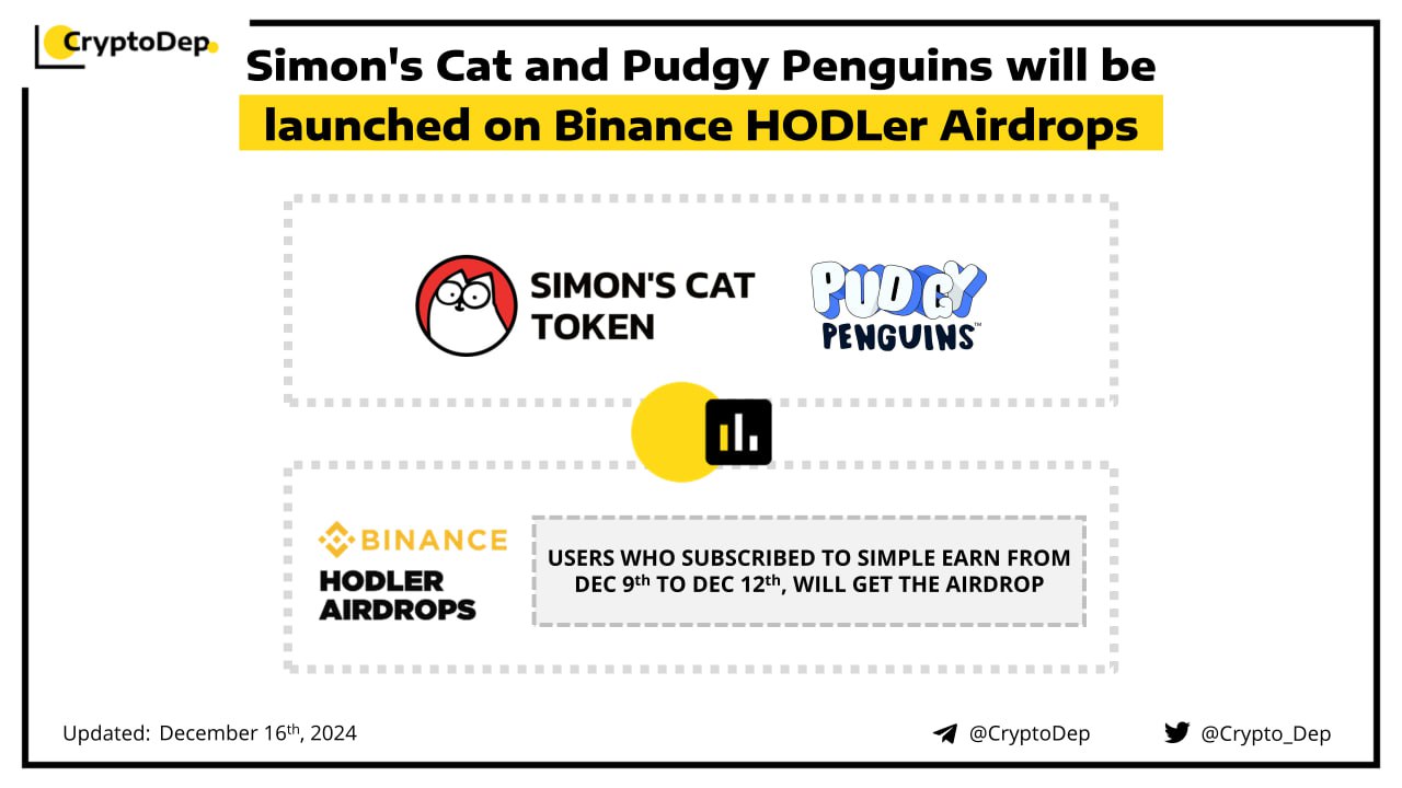 Binance announces that Simon's Cat $CAT and Pudgy Penguins $PENGU will become the 4th and 5th projects on Binance Airdrops Portal. Users who subscribed their BNB to Simple Earn products from December 9th, 00:00 UTC to December 12th 23:59 UTC will get the airdrop distribution. Binance will then list CAT on December 17th, at 9:00 AM UTC, and PENGU on December 17th, at 14:00 UTC.