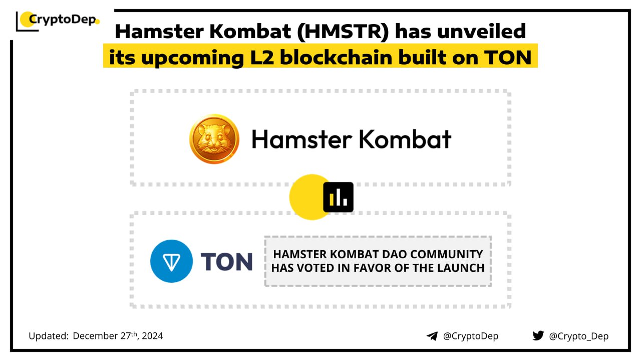 Hamster Kombat discloses its plans to launch its Layer 2 blockchain built on TON. The launch will occur as a result of the DAO community decision. The project has been previously launched as the 58th project on Binance Launchpool. Hamster Kombat is a tap-to-earn game mixed with a crypto exchange simulator.