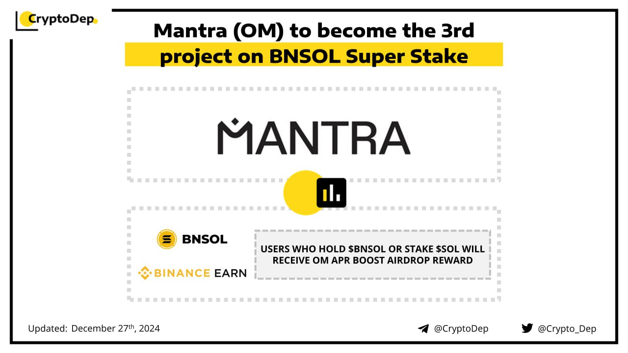 Users who hold BNSOL or stake $SOL into BNSOL in their Binance account or Binance Wallet from January 1st to January 31st will receive $OM APR Boost Airdrop Rewards respectively. Eligible users will grab a share of the 191,619 $OM reward pool. MANTRA Chain is the RWA Layer 1 Blockchain, capable of adherence and enforcement of real-world regulatory requirements.