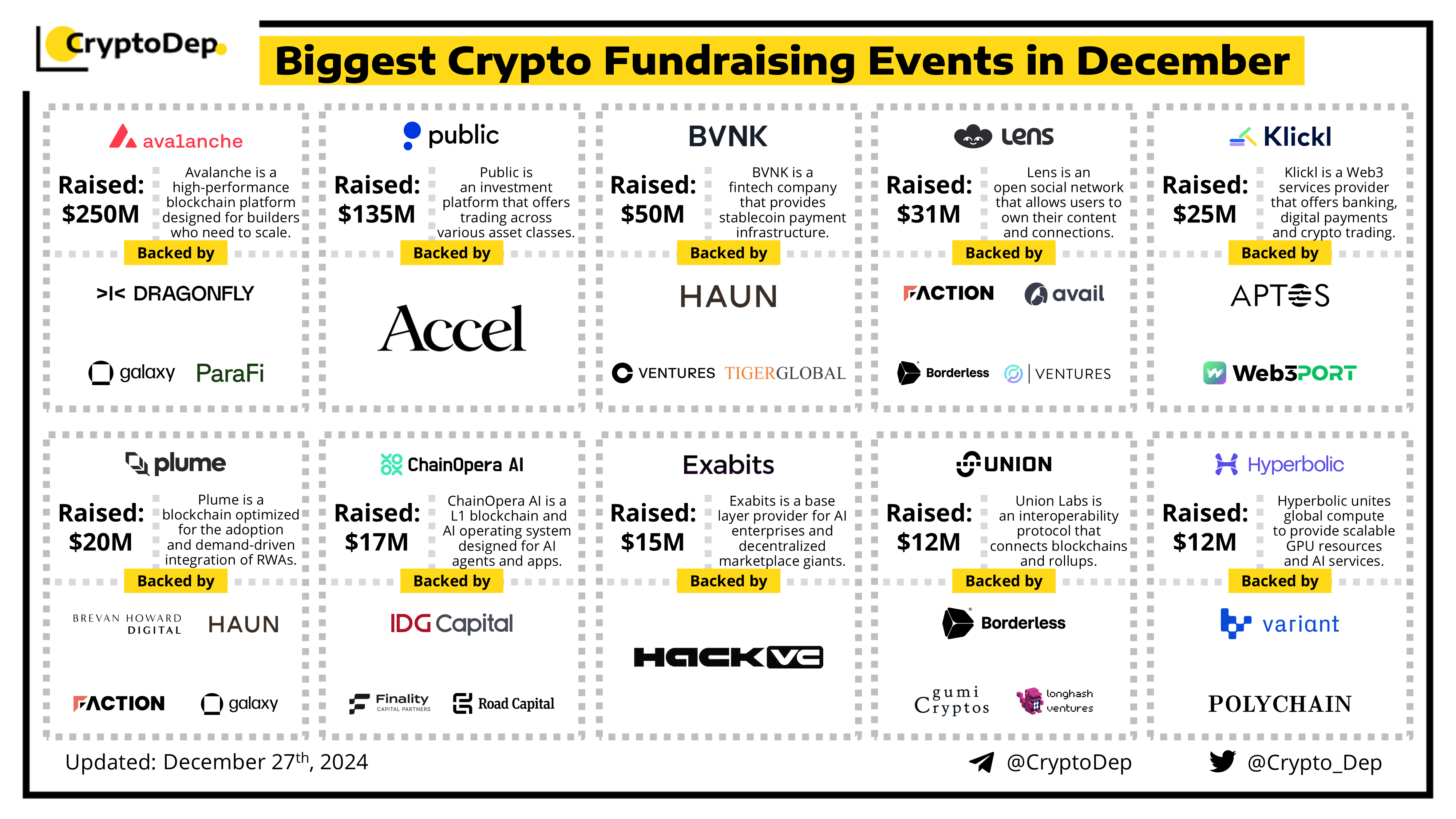 Presenting a list of the biggest crypto fundraising rounds in December 2024, backed by well-known investors such as Polychain, Dragonfly, Hack VC, Borderless Capital, Haun Ventures, Coinbase Ventures, Galaxy, Circle Ventures, Variant Fund, ParaFi Capital, Aptos Labs, Avail, and others. Let's take a look!