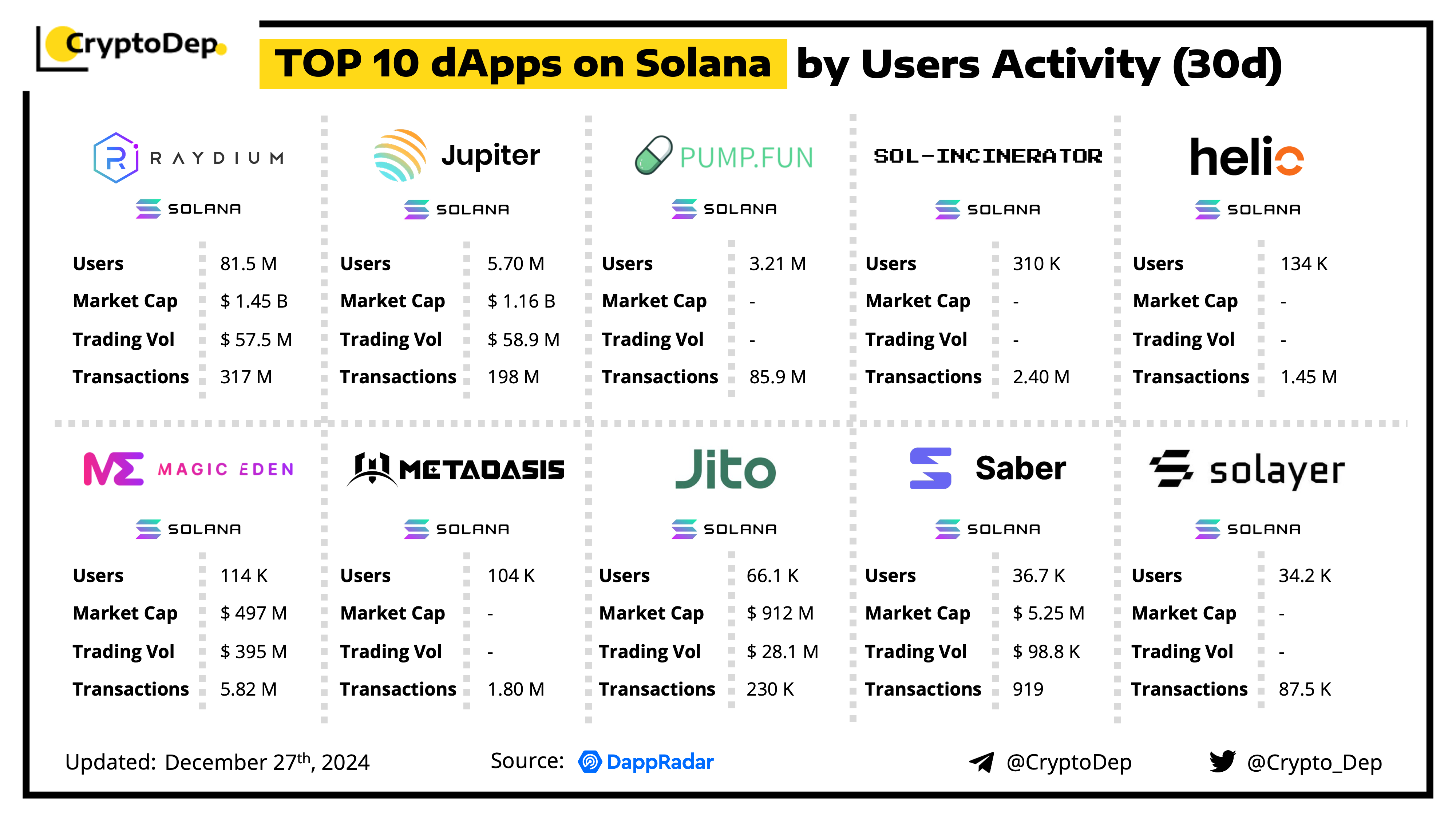 A decentralized application (dApp) is a program built on blockchain that combines a smart contract and a front-end user interface. We present the top dApps on #Solana by users activity in the last 30 days, according to the data from DappRadar.