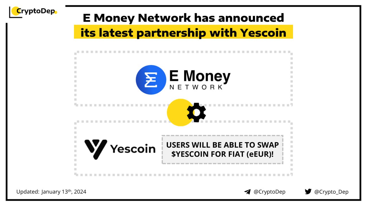 E Money Network joins forces with Yescoin, a Telegram-based blockchain game. Through this integration, users will be able to swap $YESCOIN for fiat (eEUR) using E Moneyβs wallet and Telpay Bot. Partnership with Yescoin expands E Money Network's on-and-off ramp offering and follows integrations with Lumia, ZetaChain, and others.