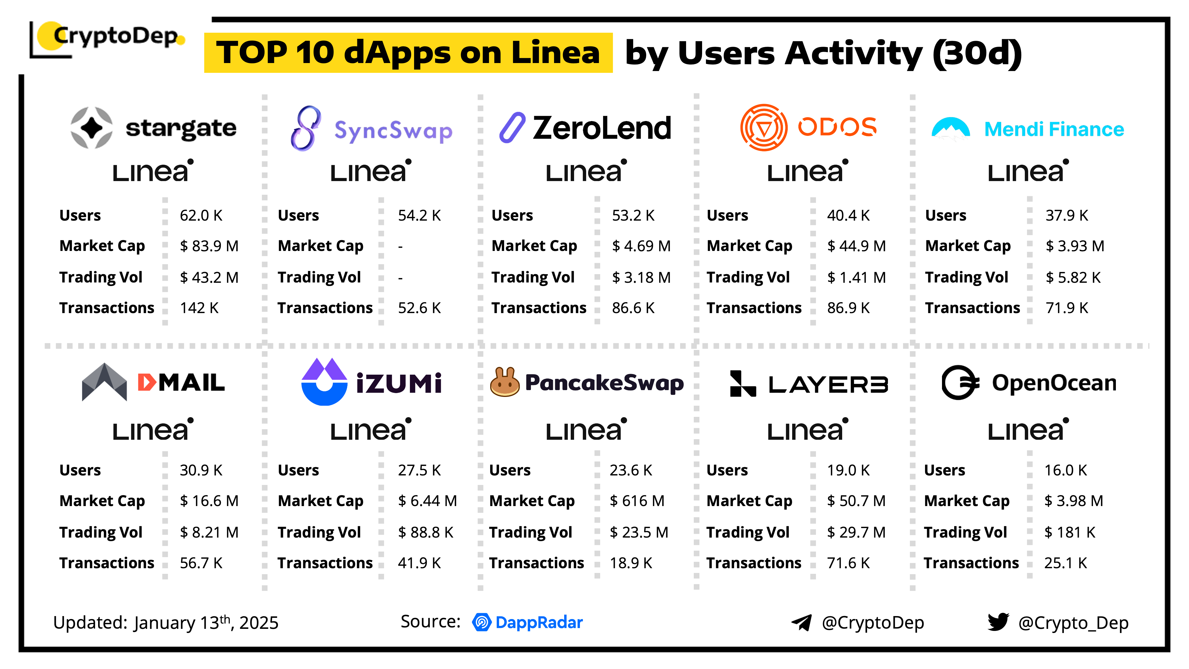 A decentralized application (dApp) is a program built on blockchain that combines a smart contract and a front-end user interface. We present the top dApps on #Linea by users activity in the last 30 days, according to the data from DappRadar.