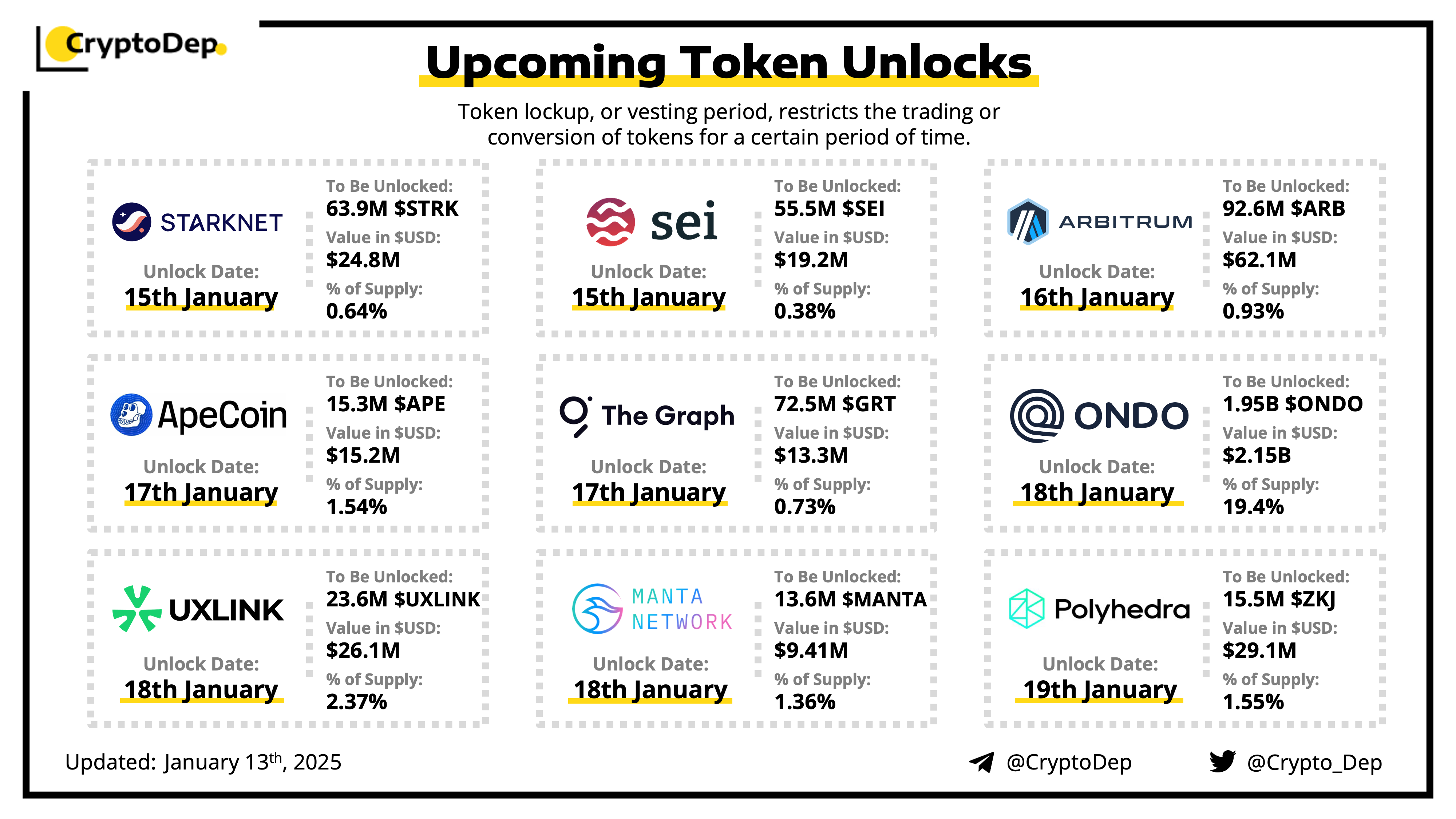 Let's take a look at the compilation of major upcoming token unlocks, diving into details such as dates, amounts, and projects related to tokens that are currently locked up, but will soon be released to the market. During this week, $ONDO, $ARB, $ZKJ, $UXLINK, and $STRK will have the biggest unlocks.