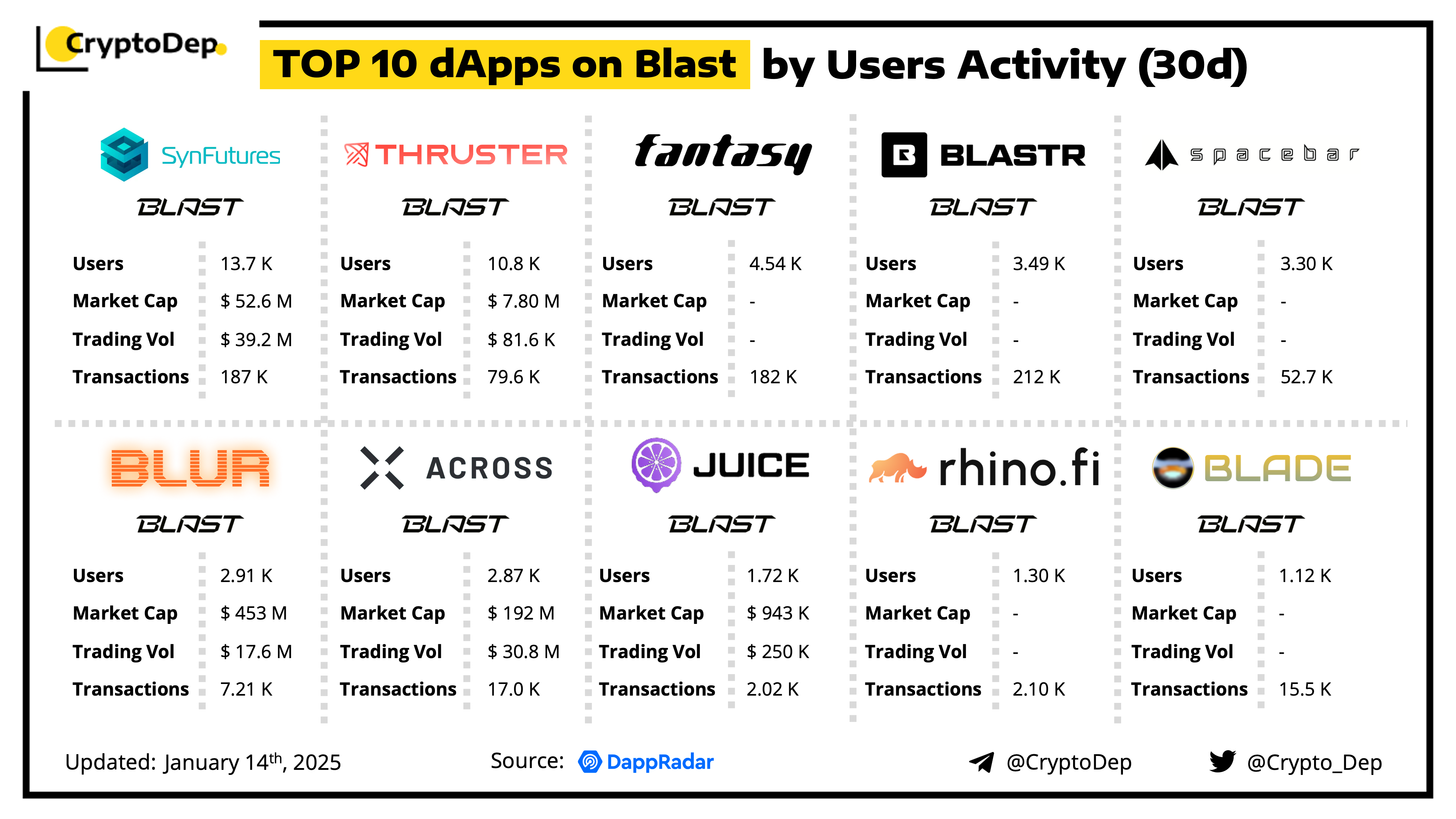 A decentralized application (dApp) is a program built on blockchain that combines a smart contract and a front-end user interface. We present the top dApps on #Blast by users activity in the last 30 days, according to the data from DappRadar.