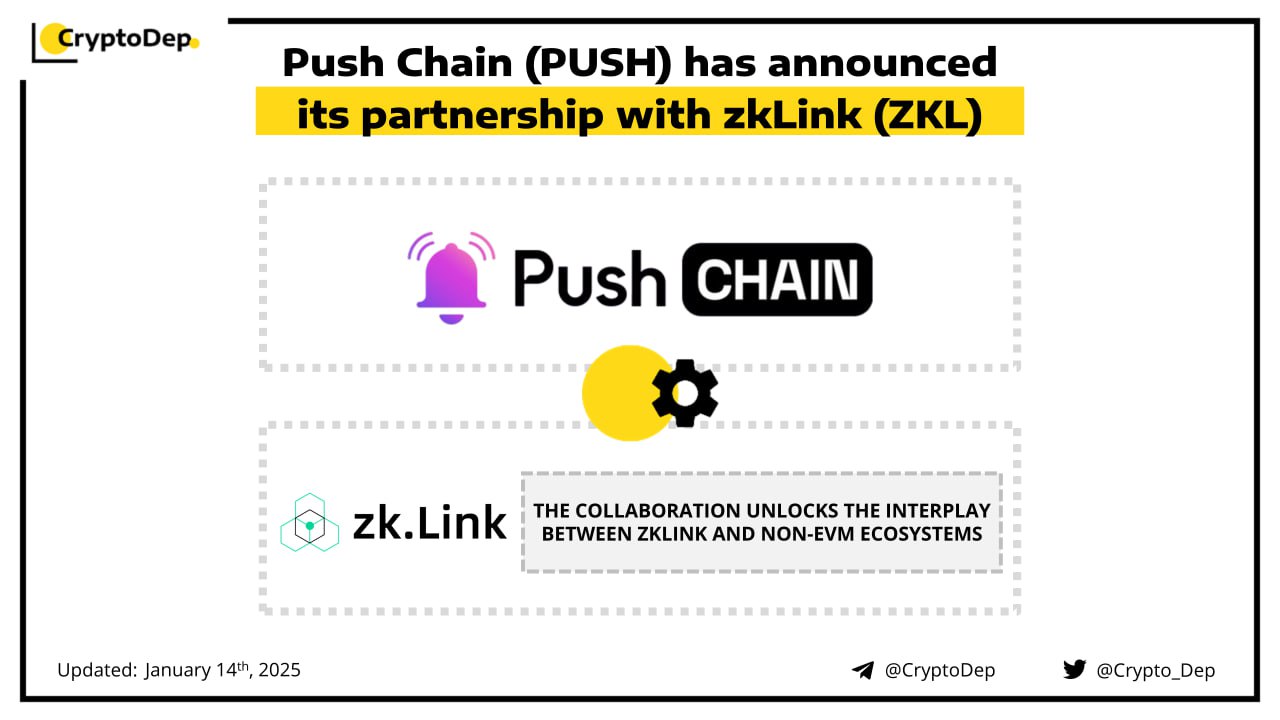 Push Chain teams up with zkLink, a developer of the first multi-rollup Layer 3 to solve liquidity fragmentation on Ethereum L2 rollups. The collaboration aims to unlock the interplay between zkLink and non-EVM ecosystems and ensure unified experiences. Among the possible use cases of the integration are chain agnostic AI Agents, universal domains, unified liquidity markets, and universal prediction markets. Push Chain is a network focused on chain abstraction and building web3 applications accessible across different networks.