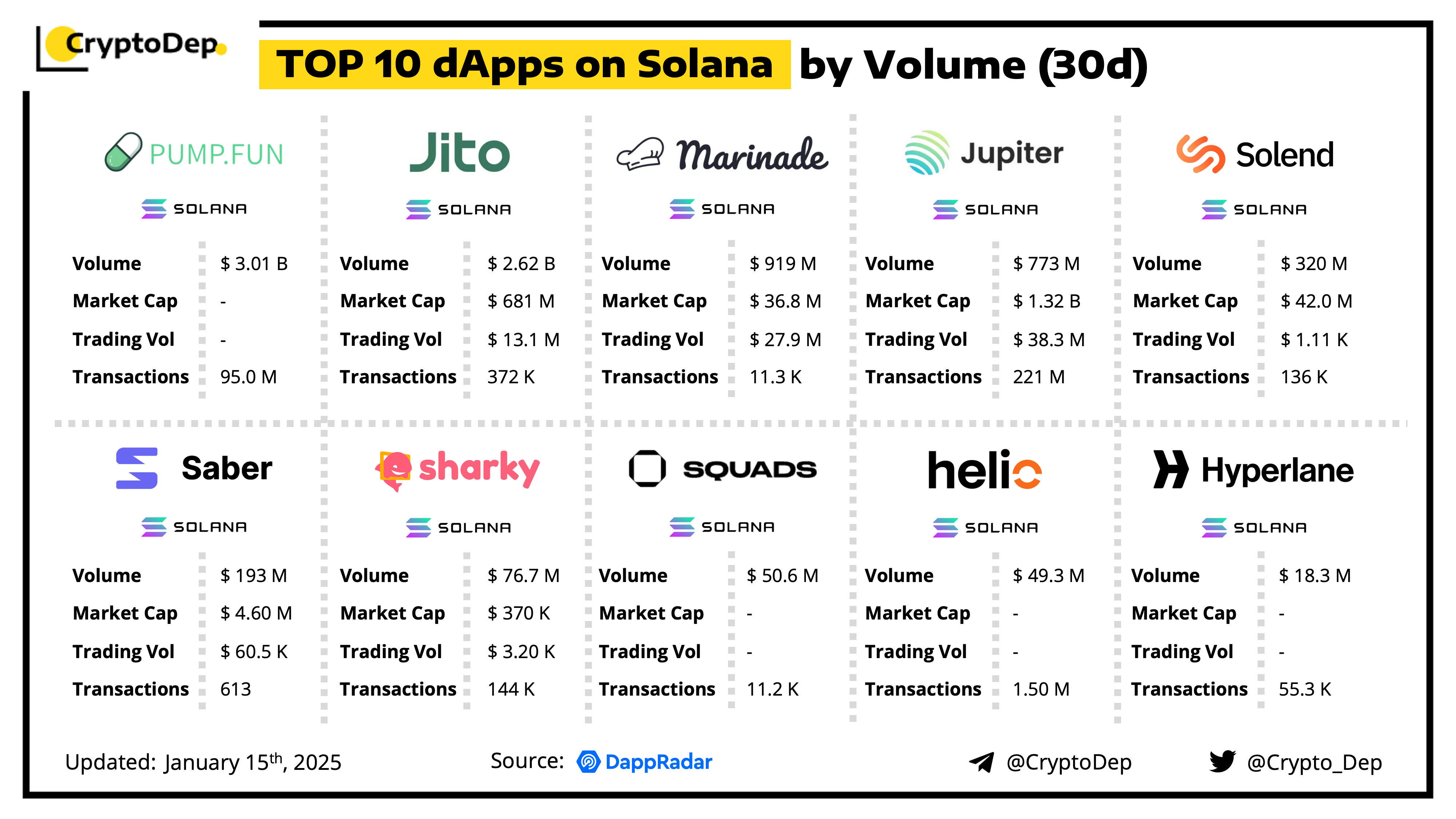 A decentralized application (dApp) is a program built on blockchain that combines a smart contract and a front-end user interface. We present the top dApps on #Solana by volume in the last 30 days, according to the data from DappRadar.