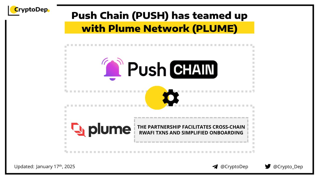 Push Chain announces its partnership with Plume Network to expand RWAfi. The collaboration will allow users to access cross-chain RWAfi transactions, a simplified onboarding process, and 180+ Plume's ecosystem apps. Moreover, dApps on Plume Network, including staking aggregators and markets will be able to provide its services cross-chain. Push Chain is a network focused on chain abstraction and building web3 applications accessible across different networks.