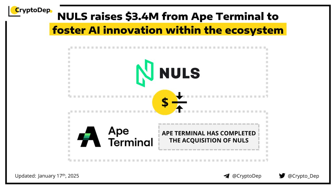 NULS has secured $3.4M from Ape Terminal to accelerate the development of AI innovation within the ecosystem. Moreover, Ape Terminal has officially completed its acquisition of NULS. The investment signifies a pivotal strategic shift for NULS, emphasizing advancing AI applications within its ecosystem. NULS is a blockchain infrastructure platform, that provides cross-chain consensus, multi-chain mechanisms, and smart contract support.