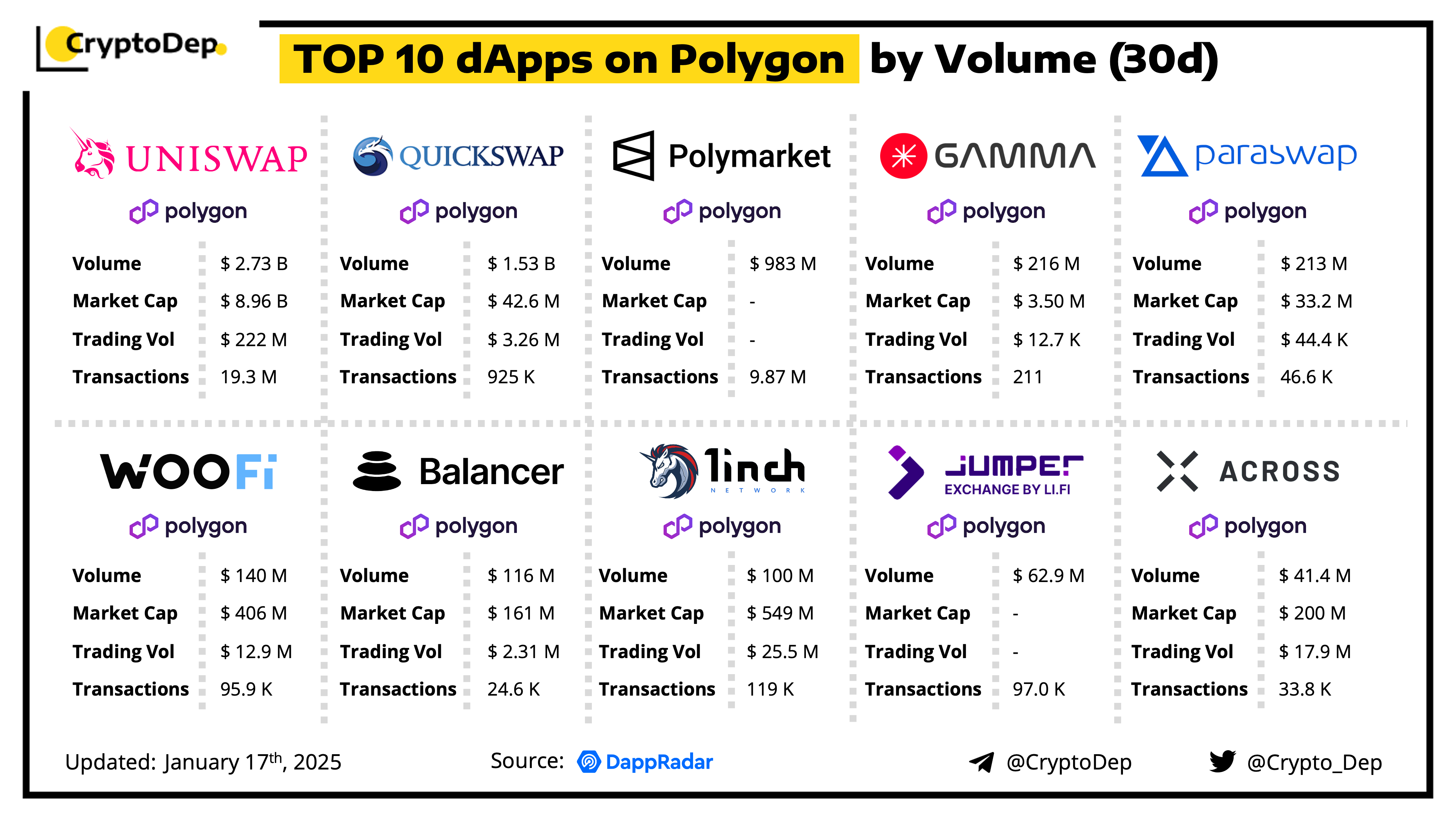 A decentralized application (dApp) is a program built on blockchain that combines a smart contract and a front-end user interface. We present the top dApps on #Polygon by volume in the last 30 days, according to the data from DappRadar.