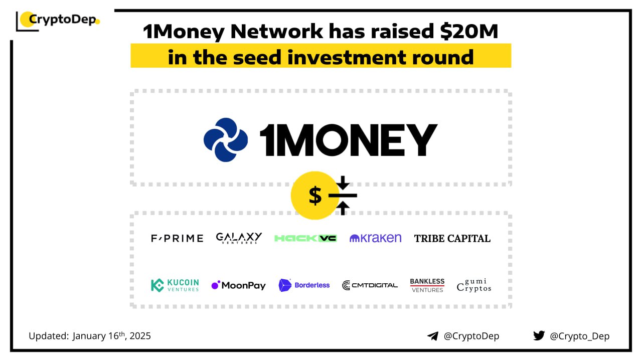 1Money Network secures $20M in seed funding to build a Layer 1 exclusively designed for stablecoin payments. Among round participants are F-Prime Capital, Galaxy Ventures, Kraken Ventures, Tribe Capital, Hack VC, Ethereal Ventures, MoonPay, KuCoin Ventures, Portage, CMT Digital, BitGo, A100x Ventures, Anagram, Generative Ventures, Borderless Capital, Protagonist, gumi Cryptos, Bankless Ventures, and others. Users can now join the 1Money Network waitlist to access early access and exclusive launch promotions.