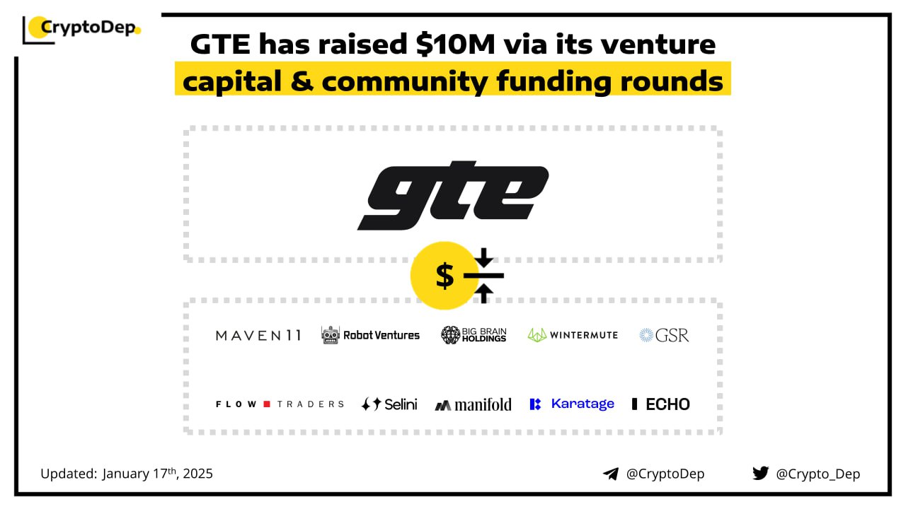 GTE, a decentralized exchange (DEX) built on the MegaETH blockchain, announces the closure of its $10M fundraising. The funding includes a $1.5M pre-seed round, $6.94M seed funding and a $2.5M community-focused round on Echo. Among venture investors are Maven 11, Wintermute, Flow Traders, Robot Ventures, Big Brain Holdings, GSR, Selini Capital, Manifold, Karatage, and others. GTE is currently operational in a private testnet phase and is preparing to launch alongside MegaETH's public testnet and mainnet launches later this year.