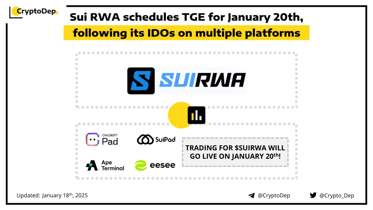 Trading for the $SUIRWA token will go live on January 20th! Users can now participate in Sui RWA's token sales on Ape Terminal, SuiPad, ChainGPT Pad, and Eesee platforms! The project will also airdrop $SUIRWA tokens to users, who stakes any amount of $SUIDEPIN tokens before January 26th. Sui RWA aims to connect AI Agents with the $7.6B RWA industry, driving real-world impact.