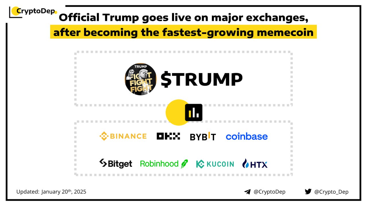 ββOfficial Trump (TRUMP) goes live on major exchanges, after becoming the fastest-growing memecoin