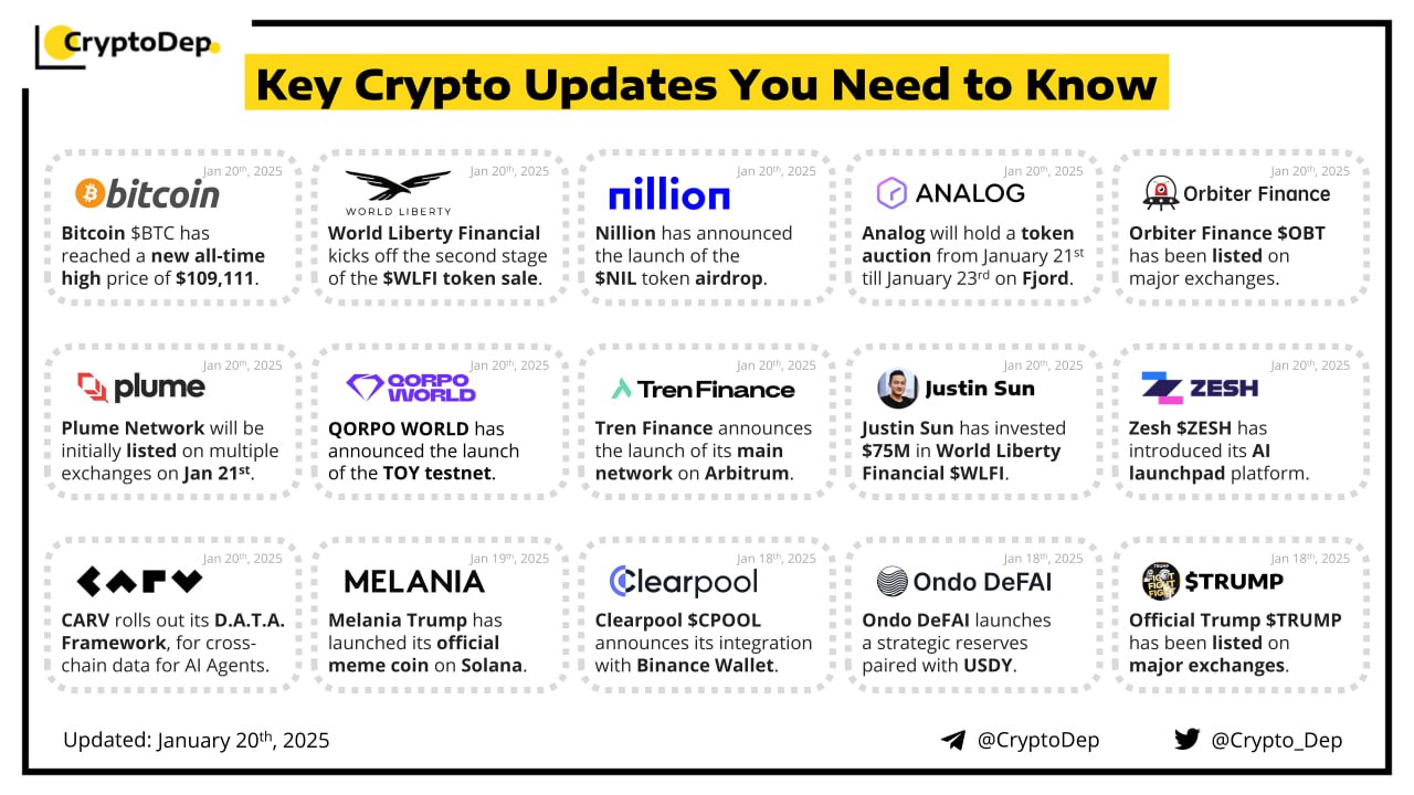 Bitcoin rose around 3.8% over the past 24 hours to set a new ATH at $109,111. The latest surge is likely driven by the launch of memecoins associated with the Trump family. During the last 24 hours, the cryptocurrency market has experienced significant volatility with over $1.2B in liquidations on centralized exchanges. BTC is now trading at $108.3K with a $2.14T market cap and 59% dominance.