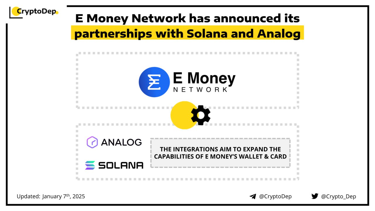 Through the integrations with Solana and Analog, E Money Network aims to expand the capabilities of E Money Wallet and E Money Card. E Money Card users can now deposit stablecoins on Solana seamlessly on the card and earn up to 2% rewards on their everyday spending. Moreover, Analog's layer-0 cross-chain communication protocol will enable cross-chain native swaps for E Money Wallet. E Money Network is a pioneering modular RWA Chain with compliance blocks.