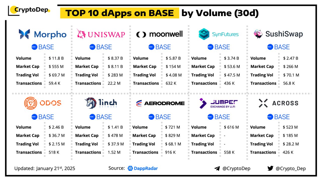 A decentralized application (dApp) is a program built on blockchain that combines a smart contract and a front-end user interface. We present the top dApps on #Base by volume in the last 30 days, according to the data from DappRadar.