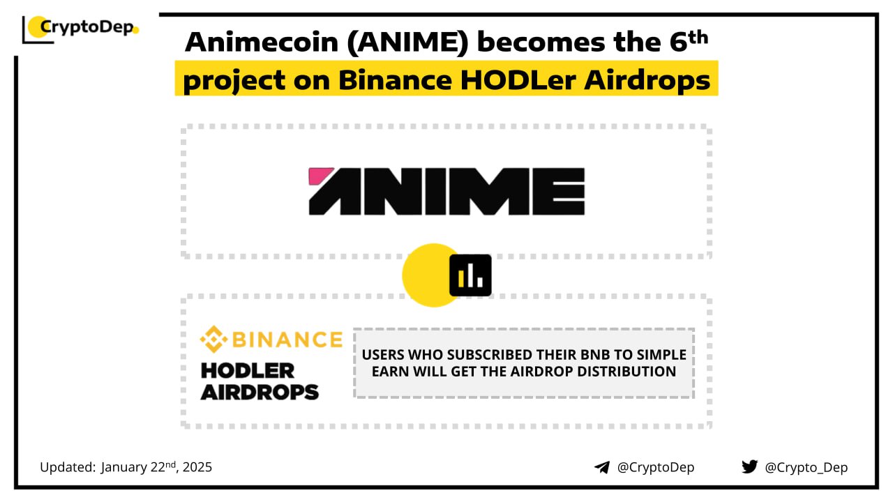 Binance has announced the 6th projects on HODLer Airdrops - Animecoin. Users who subscribed their BNB to Simple Earn products from January 17th to January 21st will get the airdrops distribution. Binance will then list $ANIME on January 23rd, at 14:00 UTC and open trading against USDT, USDC, BNB, FDUSD and TRY pairs. Backed by Arbitrum and Azuki, Anime is a project that aims to onboard fans of anime to web3 with a mix of content, games, merchandise, and NFTs.