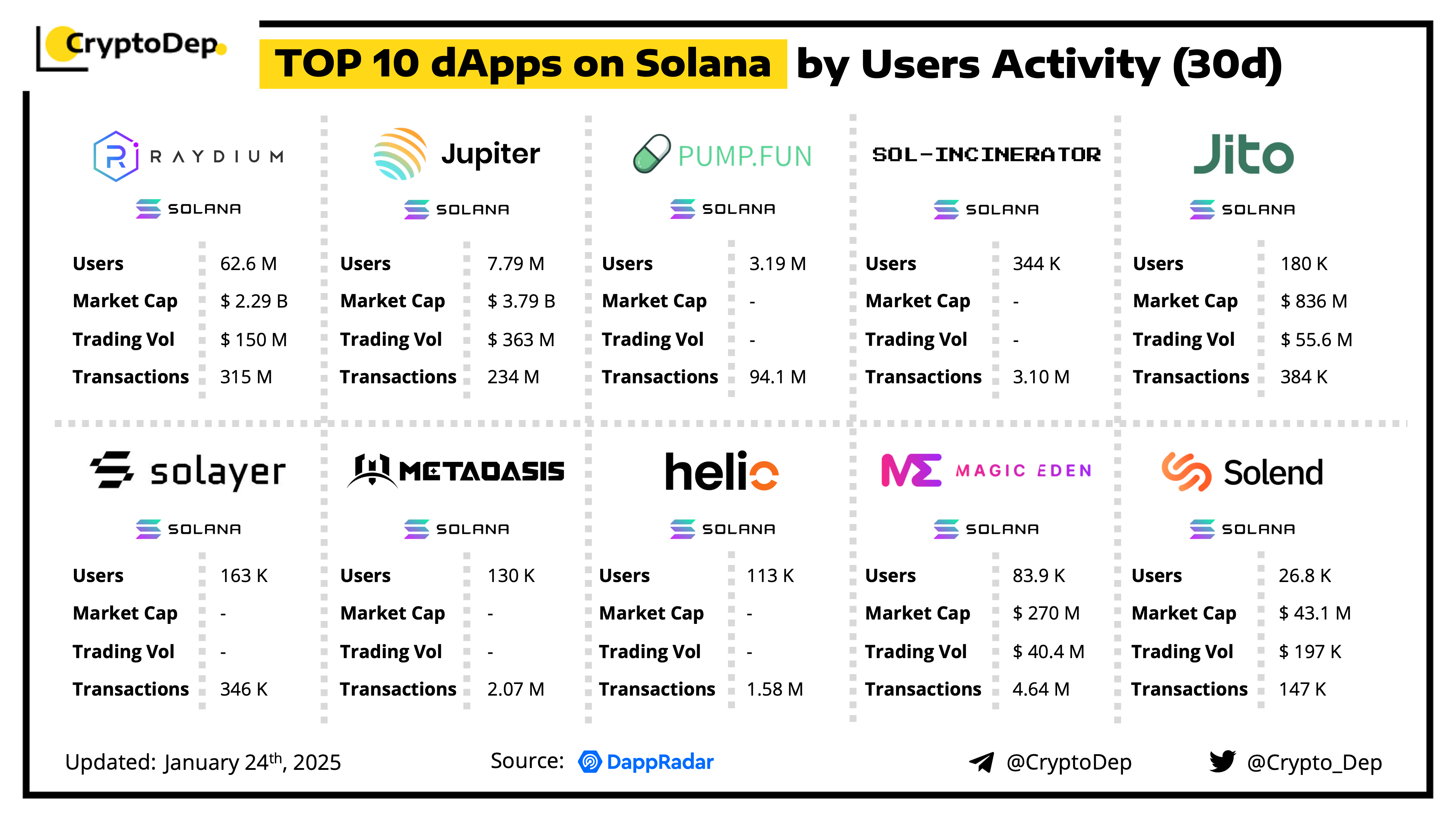 A decentralized application (dApp) is a program built on blockchain that combines a smart contract and a front-end user interface. We present the top dApps on #Solana by users activity in the last 30 days, according to the data from DappRadar.