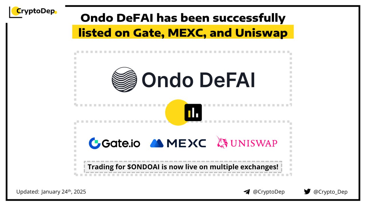 Ondo DeFAI has been successfully listed on Gate, MEXC, and Uniswap