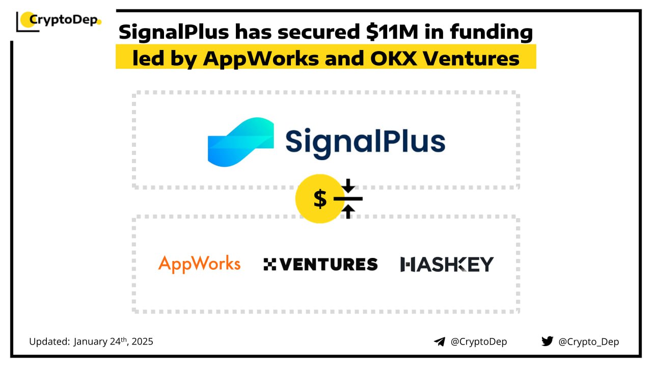 SignalPlus, an Asia-based crypto trading software service provider, raises $11M in Series B investment. The fundraising was led by AppWorks and OKX Ventures, with participation from Avenir Group and HashKey. With the newly raised capital, the company plans to expand its product suite across quantitative trading and proprietary risk management. SignalPlus provides institutional-grade trading tools in the crypto space, enabling users to navigate the trading of crypto derivatives.