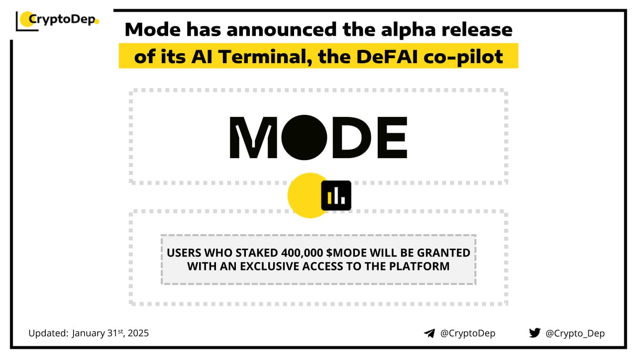 Mode Terminal goes live, providing an exclusive access for users who staked 400,000 $MODE. The AI Terminal enables its users to perform numerous DeFi actions on Velodrome, Balancer, Ethena, Sturdy Finance, and other venues. Earlier in January, Mode launched its AI Agent Founder School with $100K in prizes. Mode is the Layer 2 (L2) building at the intersection of DeFi and AI.