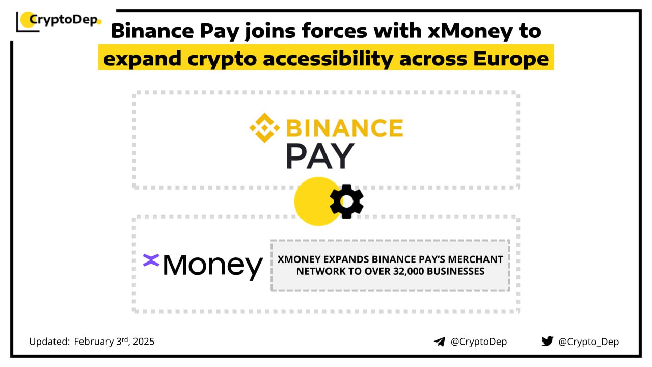 Binance Pay has announced its partnership with xMoney, a leading Web3 payment provider in Europe. This partnership connects Binance Pay users to xMoneyβs merchant network, enabling over 20,000 businesses to accept cryptocurrency directly. Binance Pay is a contactless, borderless, and secure cryptocurrency payment feature available on the Binance App.