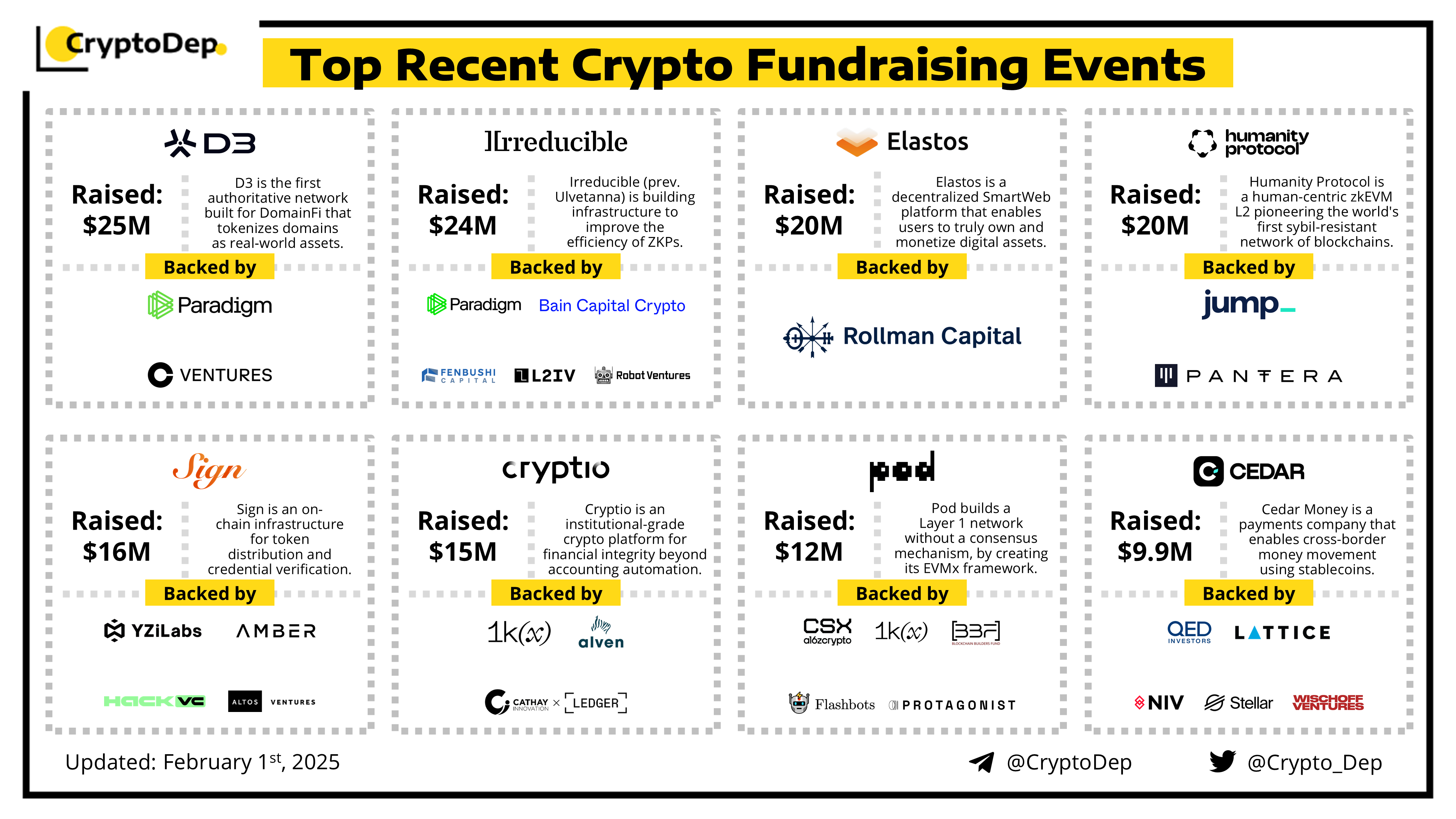 Presenting a list of some recent crypto fundraising events, backed by well-known investors such as YZi Labs (Binance Labs), Paradigm, Pantera Capital, a16z crypto, 1kx, Hack VC, Coinbase Ventures, Bain Capital, and others. Let's take a look!