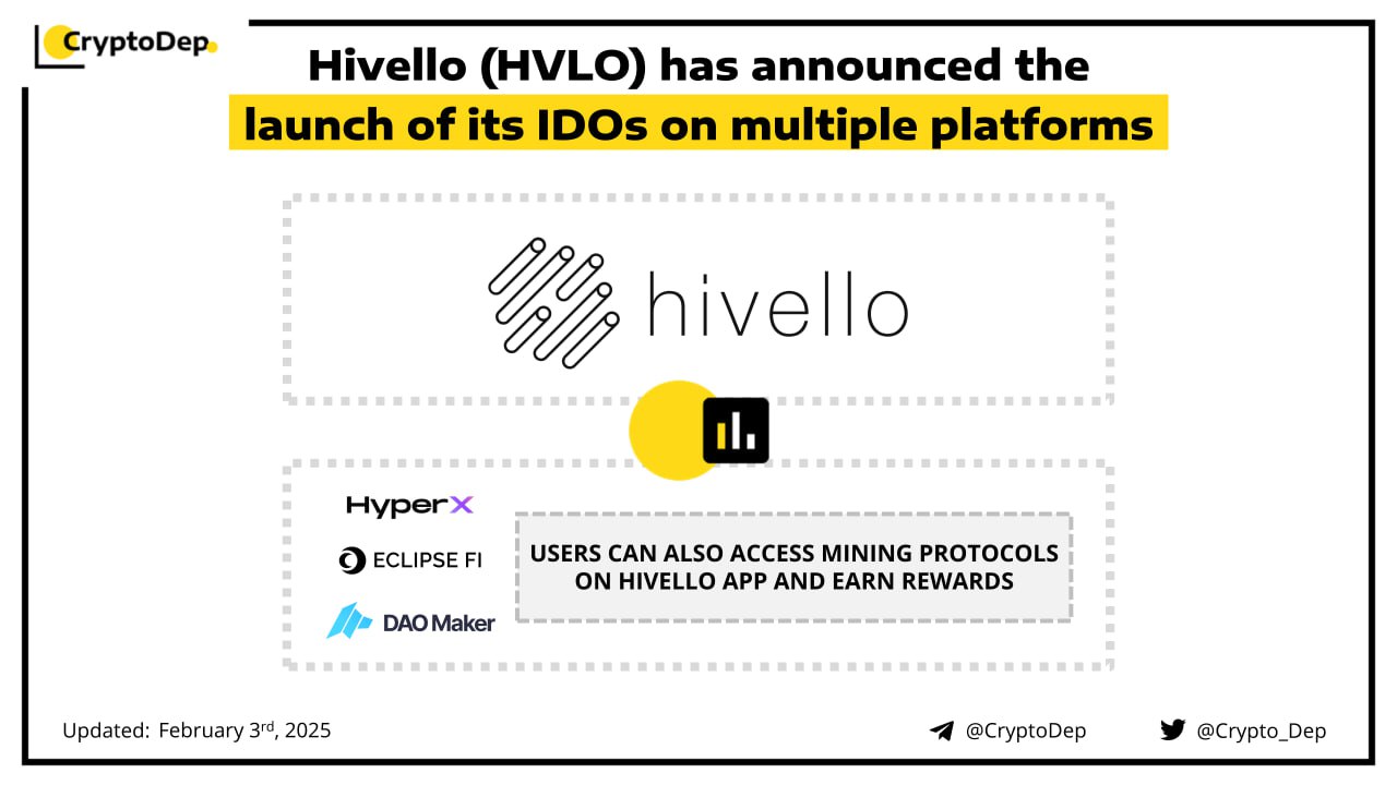 Hivello's $HVLO token sales on DAO Maker and EclipseFi are now live, while the sale on HyperX Pad will go live on February 5th! Moreover, users can contribute to the ecosystem by downloading Hivello's app and accessing mining protocols. The platform allows users to manage mining activities, track earnings, and monitor performance in real-time. Hivello is a decentralized platform that simplifies and democratizes participation in DePIN.