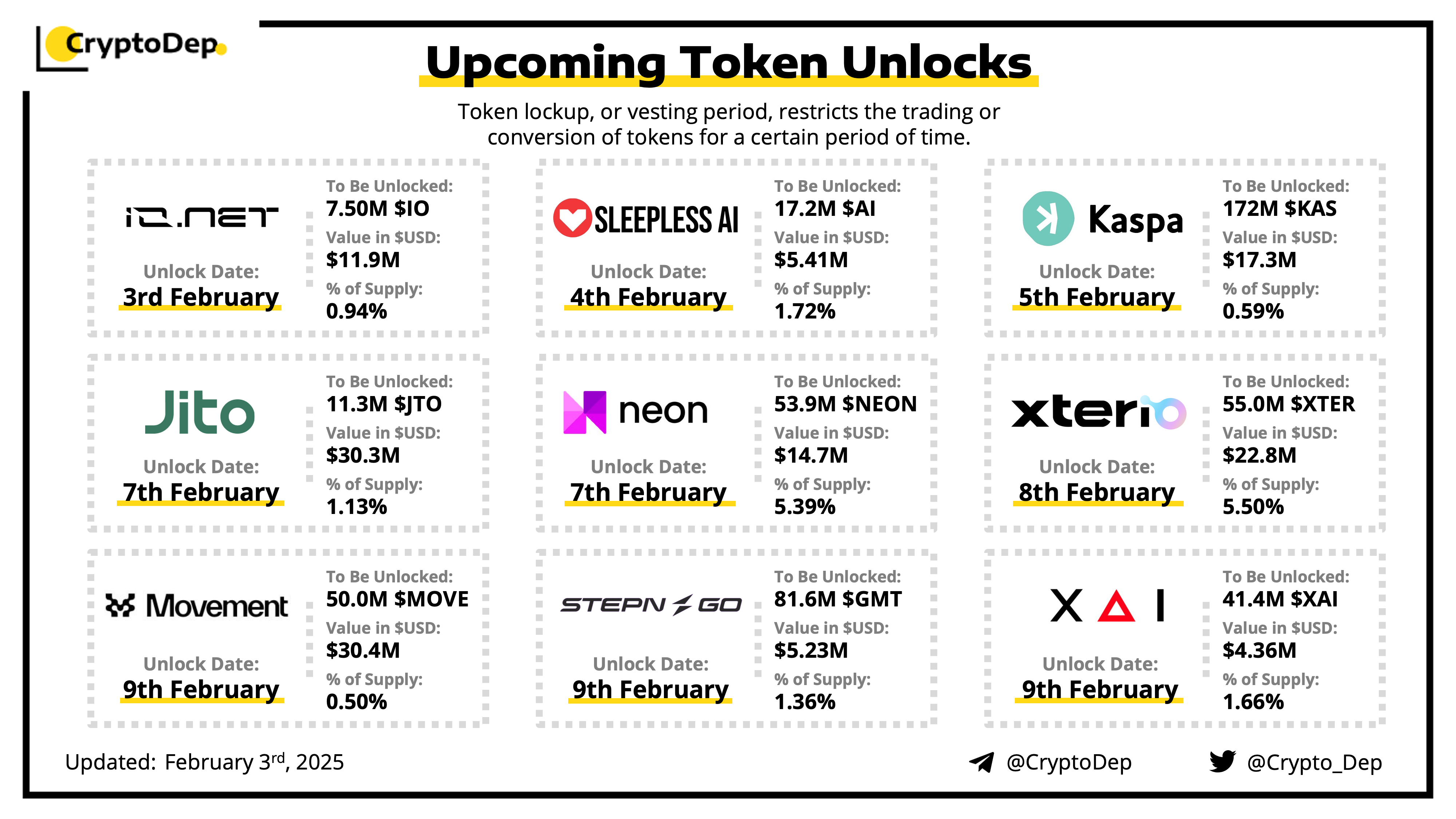 Let's take a look at the compilation of major upcoming token unlocks, diving into details such as dates, amounts, and projects related to tokens that are currently locked up, but will soon be released to the market. During this week, $MOVE, $JTO, $XTER, $KAS, and $NEON will have the biggest unlocks.