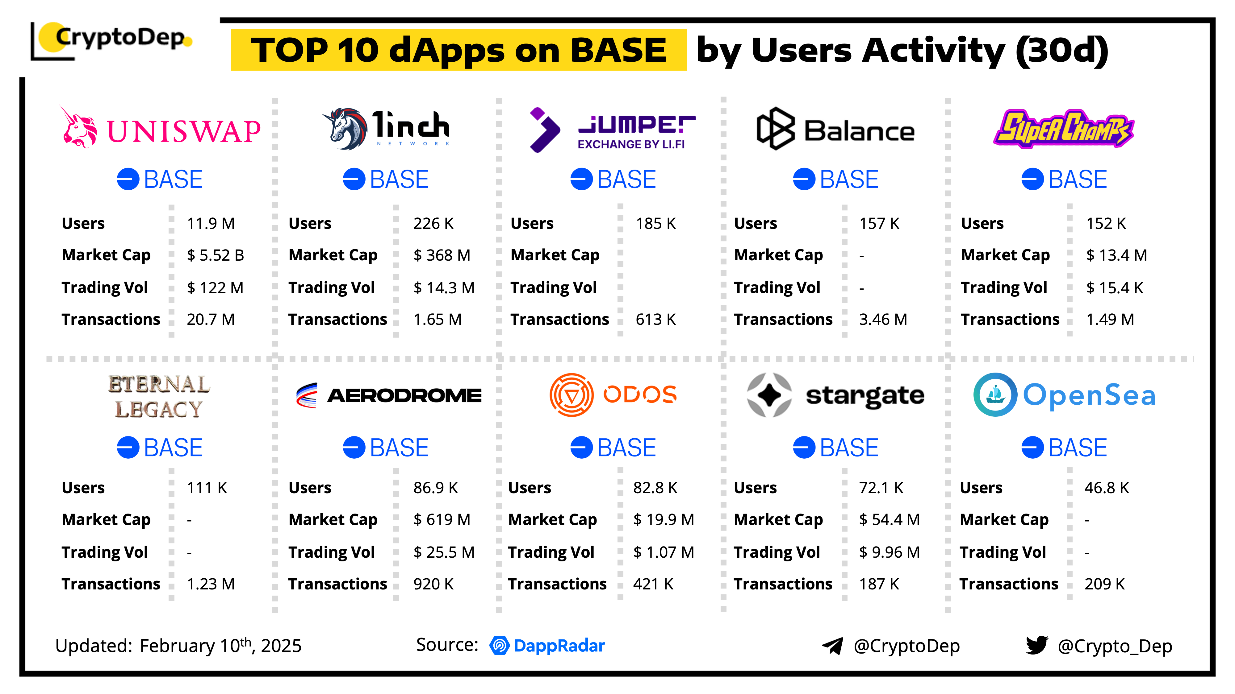 A decentralized application (dApp) is a program built on blockchain that combines a smart contract and a front-end user interface. We present the top dApps on #Base by users activity in the last 30 days, according to the data from DappRadar.
