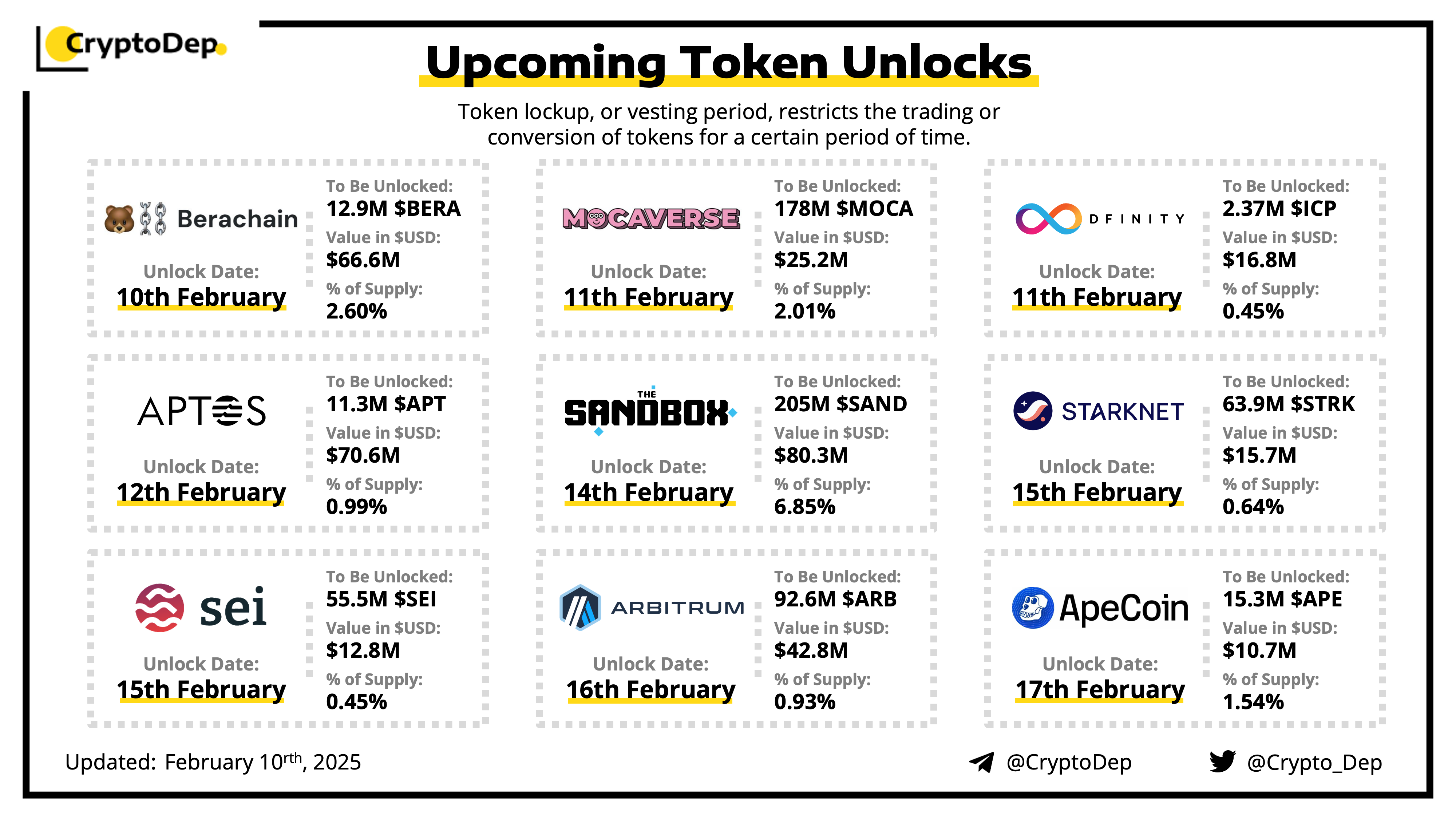 Let's take a look at the compilation of major upcoming token unlocks, diving into details such as dates, amounts, and projects related to tokens that are currently locked up, but will soon be released to the market. During this week, $SAND, $APT, $BERA, $ARB, and $MOCA will have the biggest unlocks.