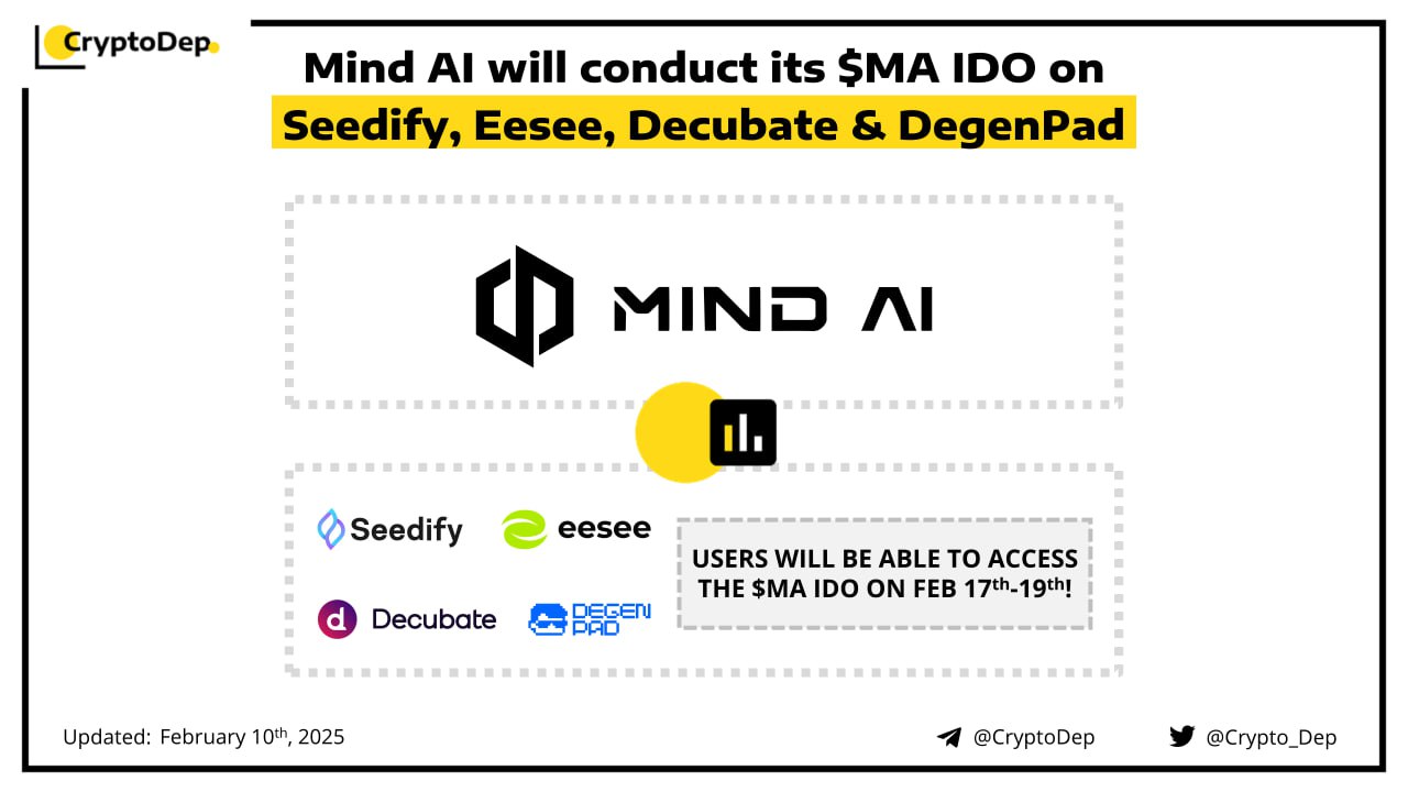 Mind AI has announced that its upcoming $MA IDO will take place on Seedify, Eesee, Decubate, and DegenPad on February 17th-19th. The project has recently launched its AI-powered assistant for smarter crypto trading decisions - Mind AI Agent. Mind AI is a trading insights platform powered by social intelligence & AI agents.