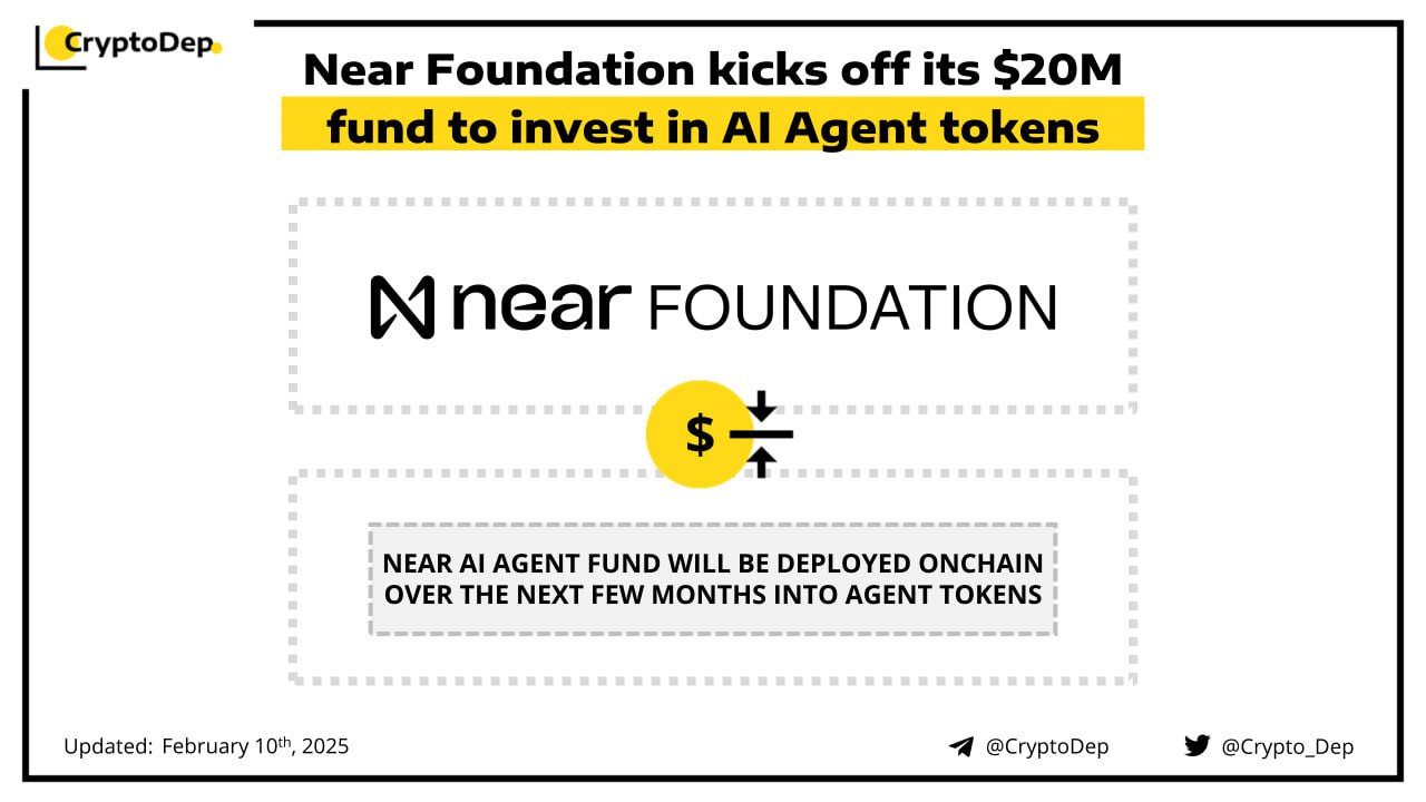 Near Foundation has announced the launch of its inaugural $20M AI Agent fund. NEAR AI Agent Fund will be deployed onchain over the next few months into agent tokens built on NEAR technology. Moreover, the agent fund will complement other builder-focused initiatives in the NEAR ecosystem including the Horizon AI accelerator cohorts and AI hackathons.