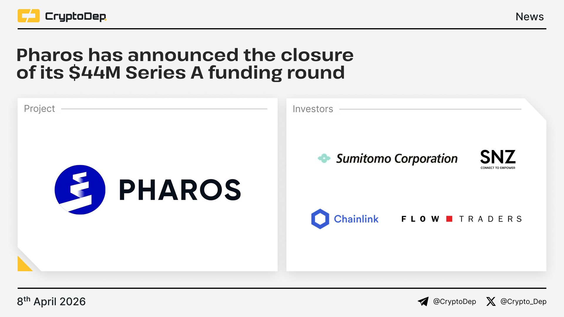 Among round participants are Sumitomo Corporation's CVC arm, SNZ Holdings, Chainlink, and Flow Traders. Pharos is a financial-grade, asset-native Layer 1, built a deep-parallel execution architecture with native compliance to support real-time, institutional applications at internet scale.