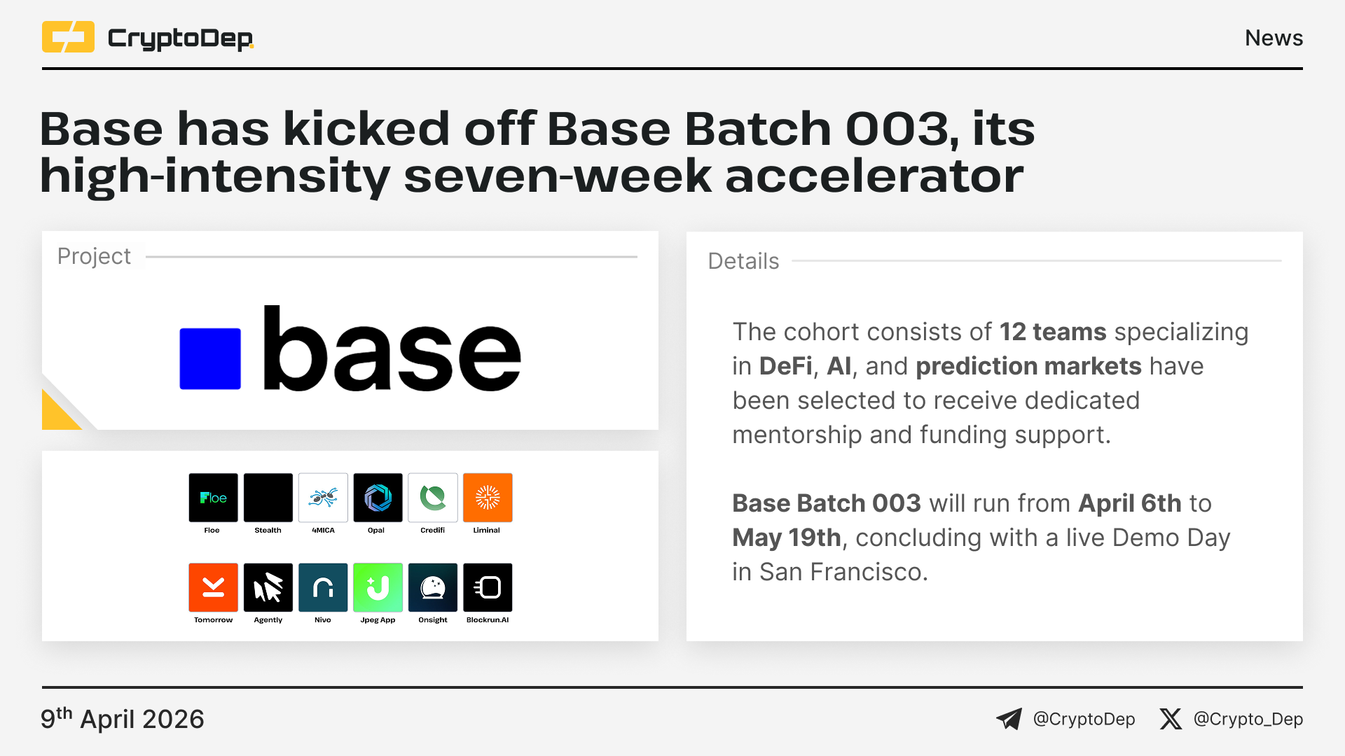The cohort consists of 12 teams specializing in DeFi, AI, and prediction markets have been selected to receive dedicated mentorship and funding support. Base Batch 003 will run from April 6th to May 19th, concluding with a live Demo Day in San Francisco.