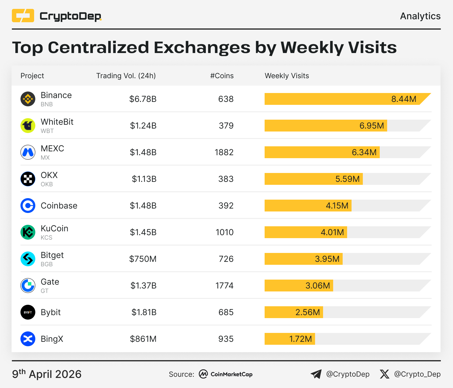 Let's take a look at the ranking of top centralized exchanges by weekly visits. Weekly visits to the website (not including mobile app) based on data from SimilarWeb and CoinmarketCap.