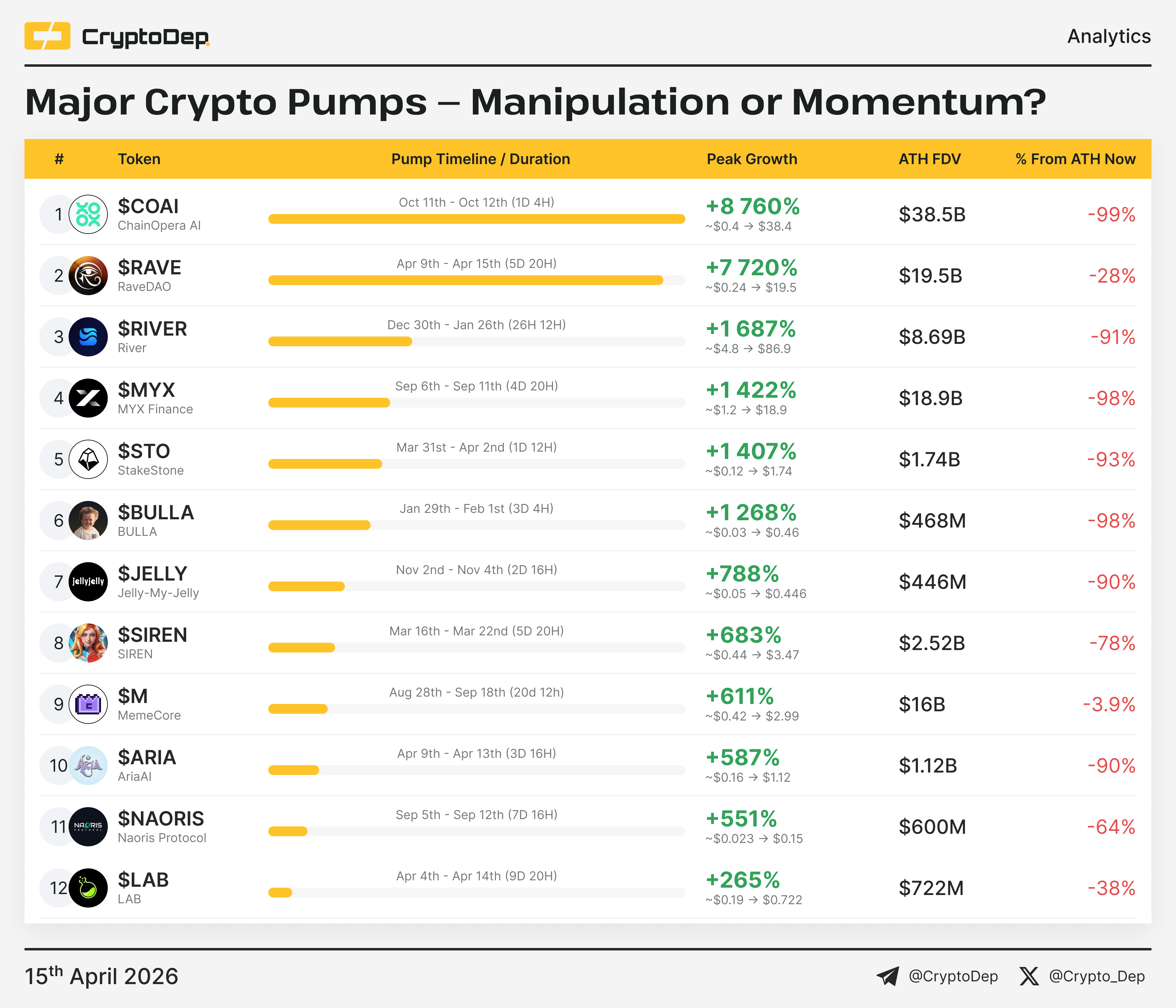 From $COAI's 36-hour +8,760% explosion to $LAB's 9-day +265% grind, the 12 tokens share more than outsized gains. Most ran on MEXC or Gate, had under 25% of supply circulating at the time of the pump, and returned to near pre-pump levels within weeks.