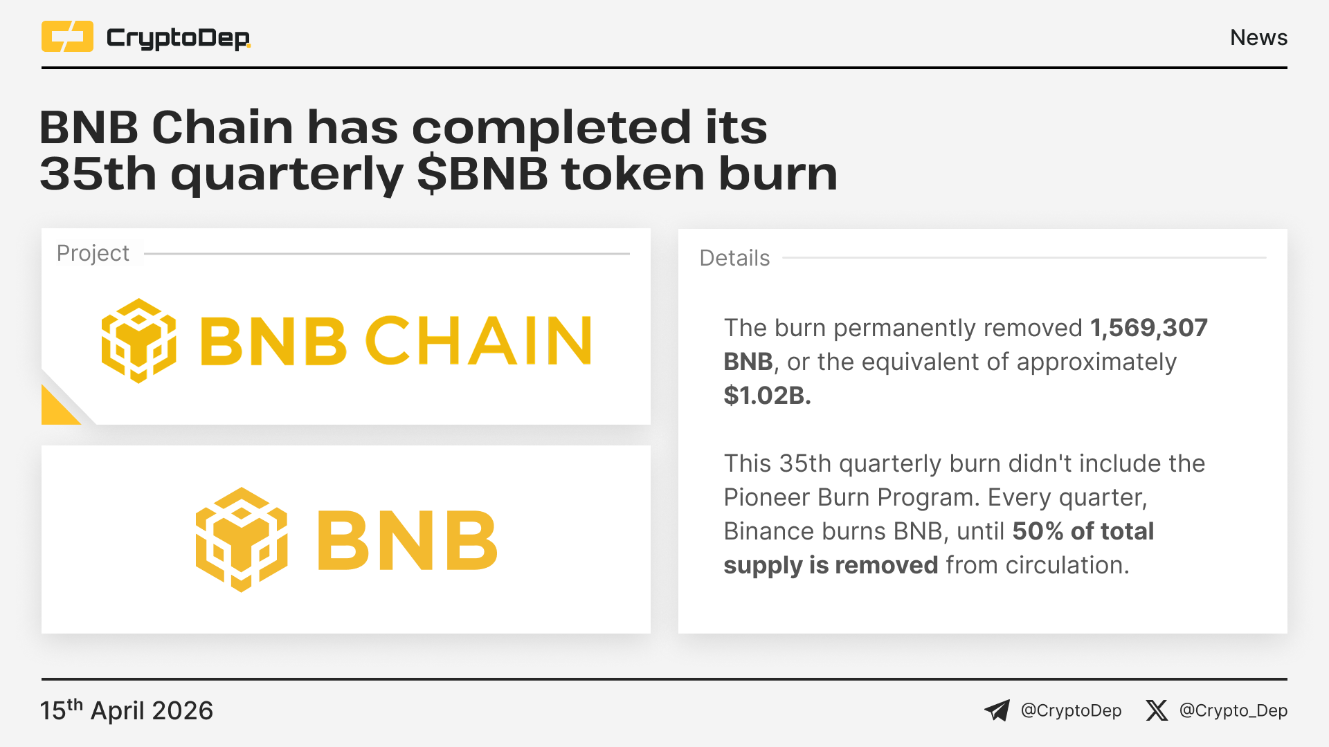 The burn permanently removed 1,569,307 BNB, or the equivalent of approximately $1.02B. The latest quarterly burn didn't include the Pioneer Burn Program. Every quarter, Binance burns BNB, until 50% of total supply is removed from circulation.
