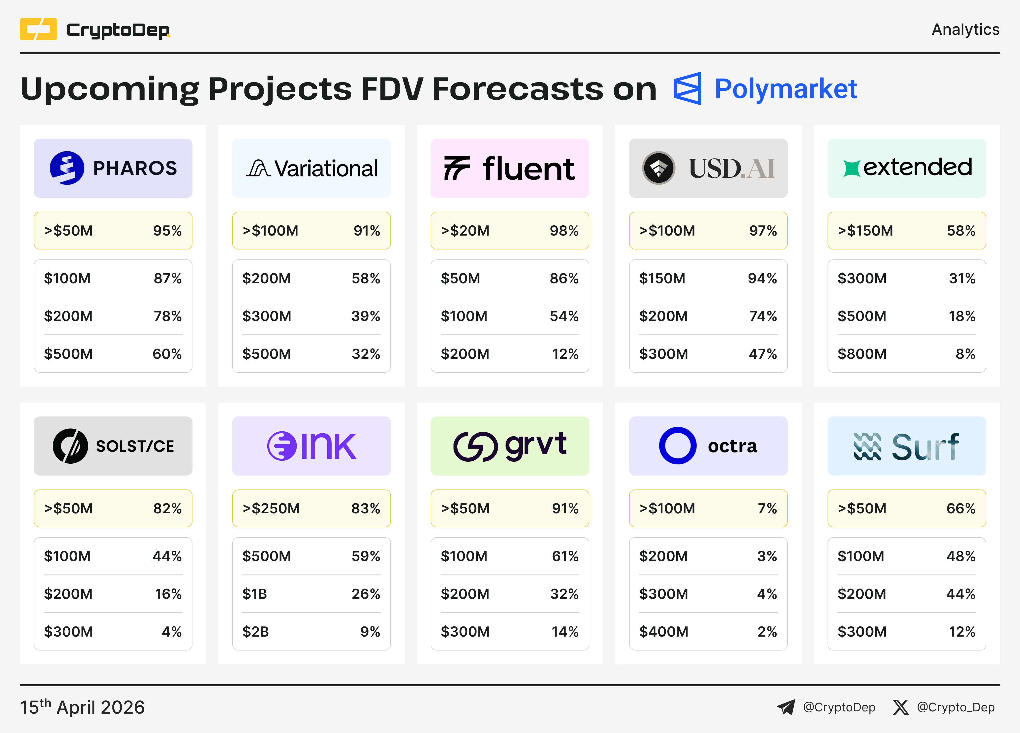Polymarket pre-market pools are already pricing early outcomes for Pharos, Variational, Fluent, USD AI, Exteded, Solstice, Ink, GRVT, Octra, and Surf.